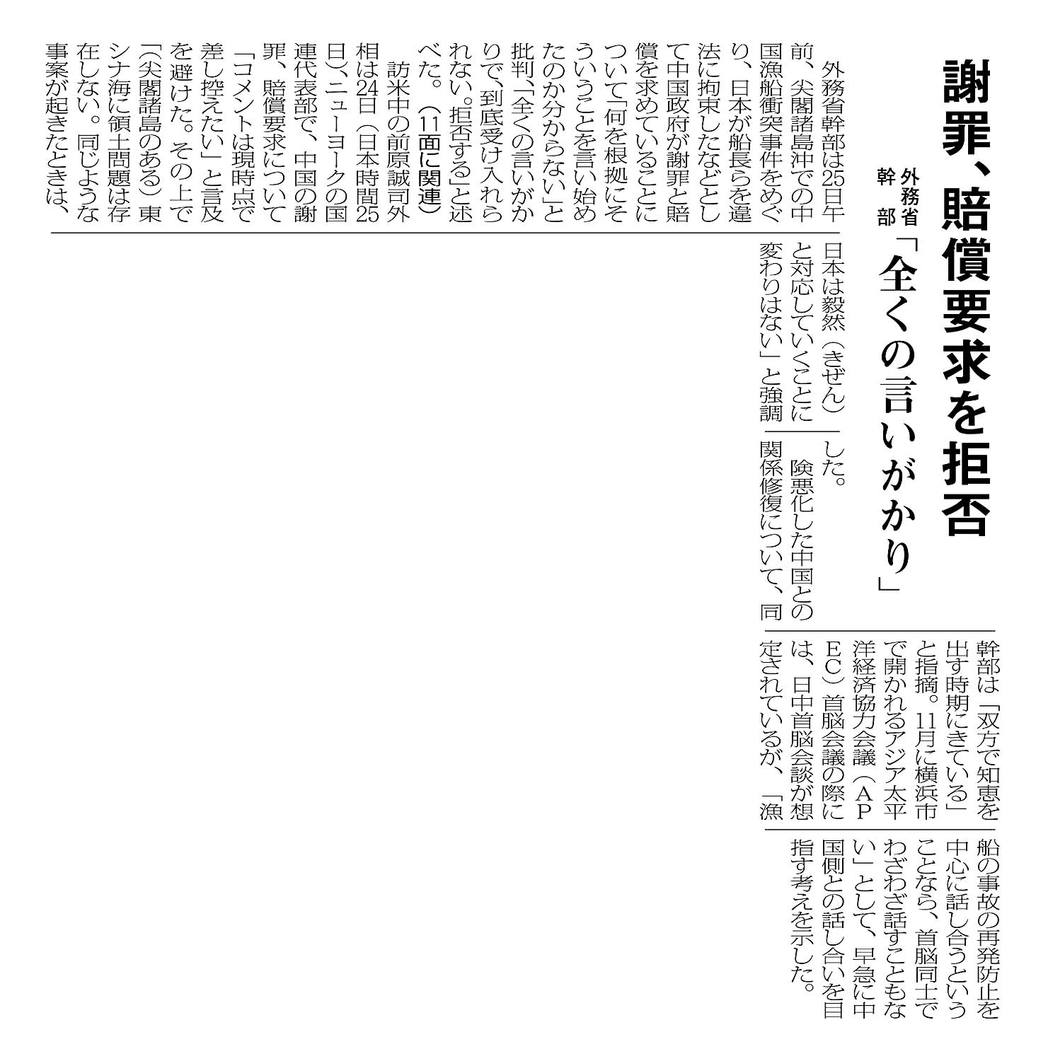 > 謝罪、賠償要求を拒否/外務省幹部「全くの言いがかり」: