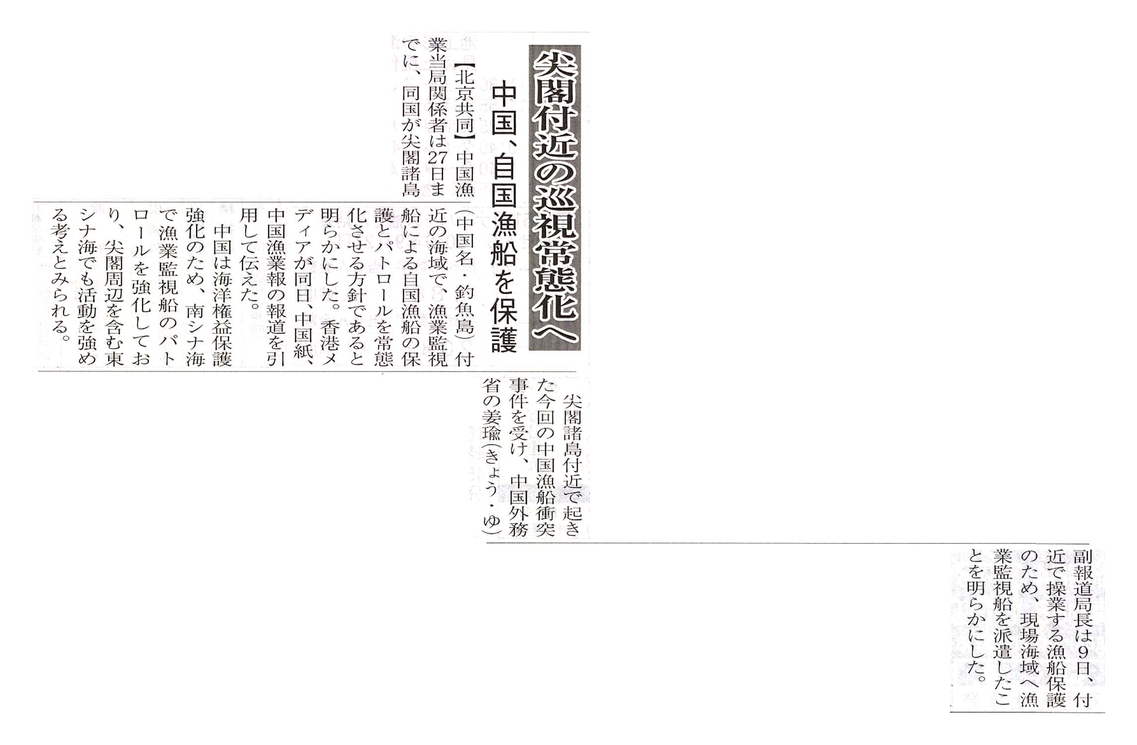 > 尖閣付近の巡視常態化へ/中国、自国漁船を保護: