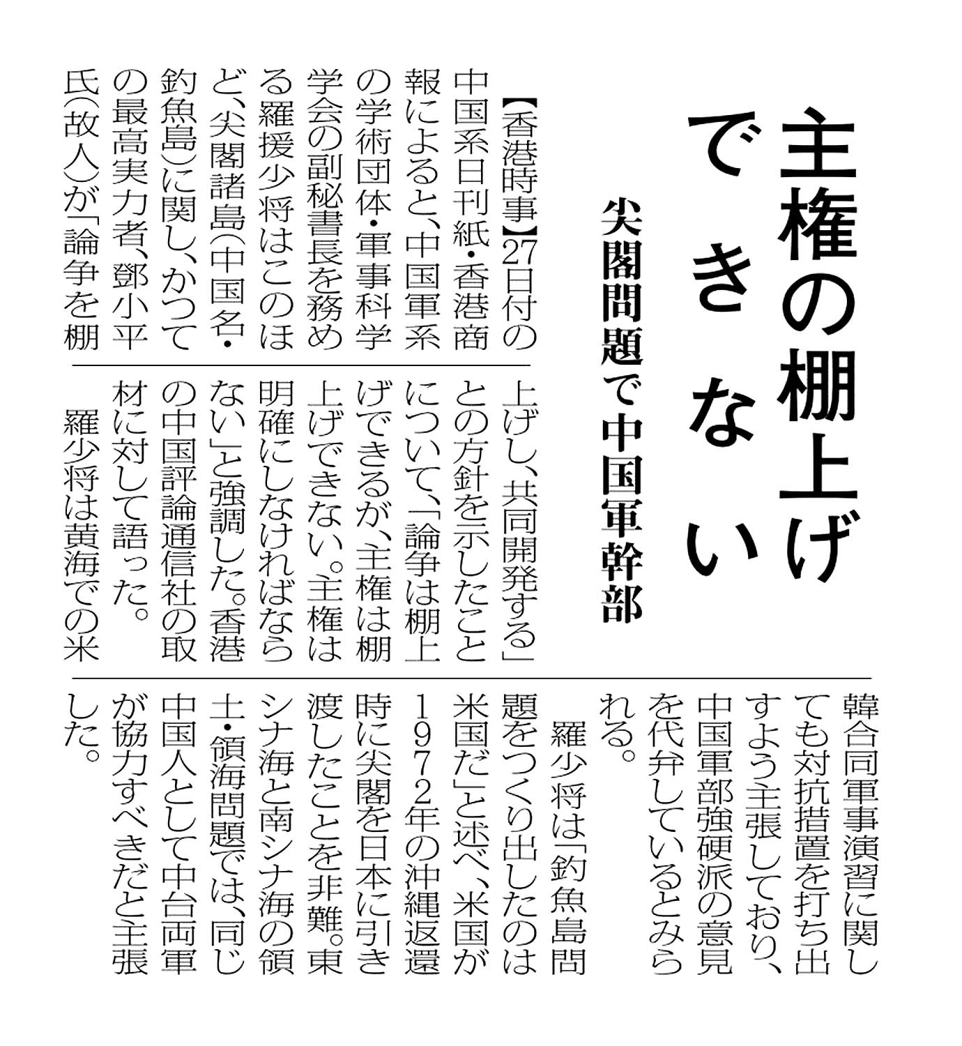 > 主権の棚上げできない/尖閣問題で中国軍幹部: