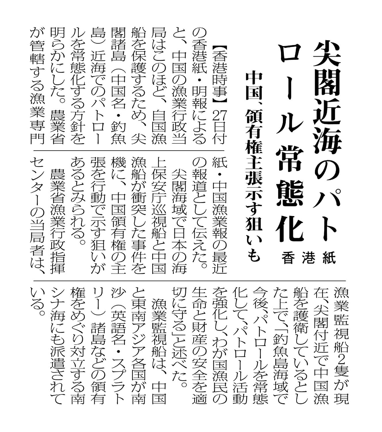 > 尖閣近海のパトロール常態化/中国、領有権主張示す狙いも: