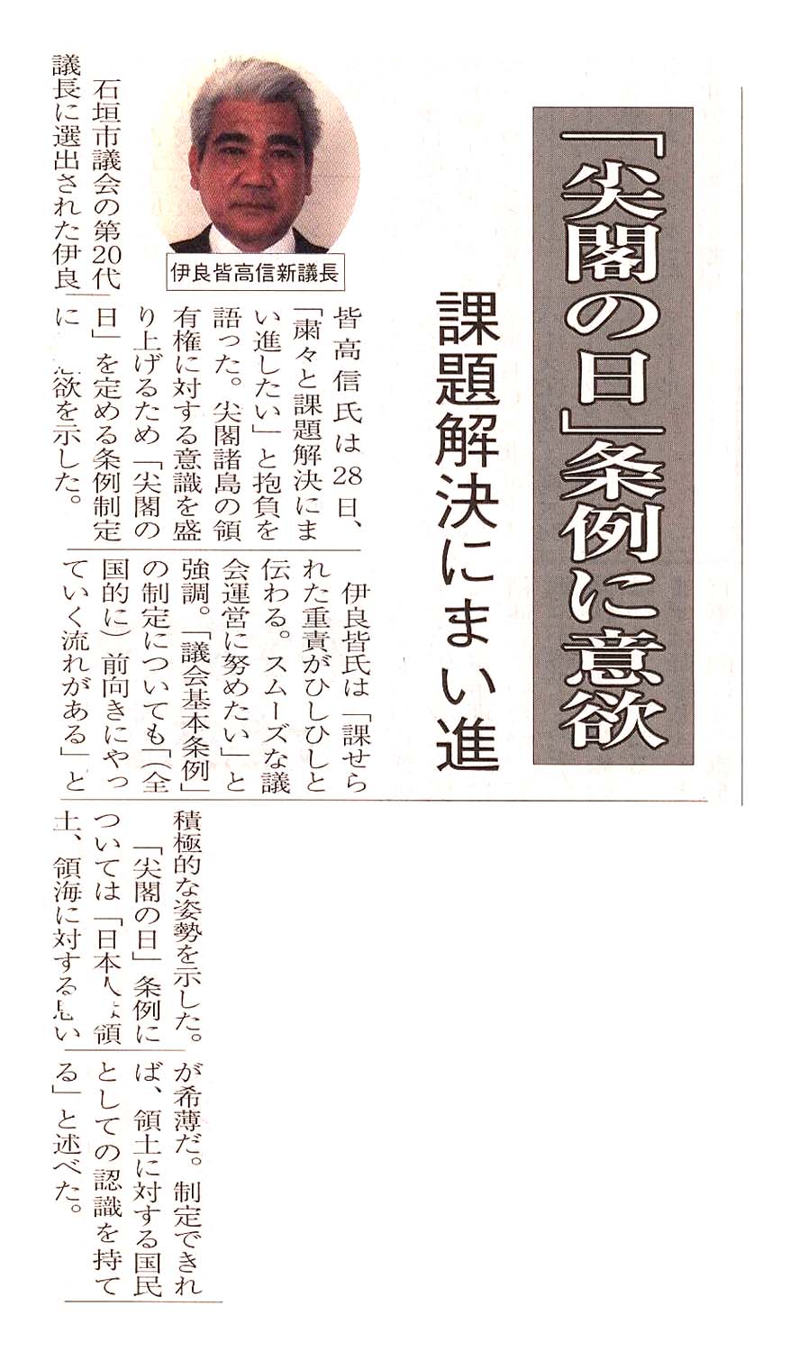 > 「尖閣の日」条例に意欲/課題解決にまい進: