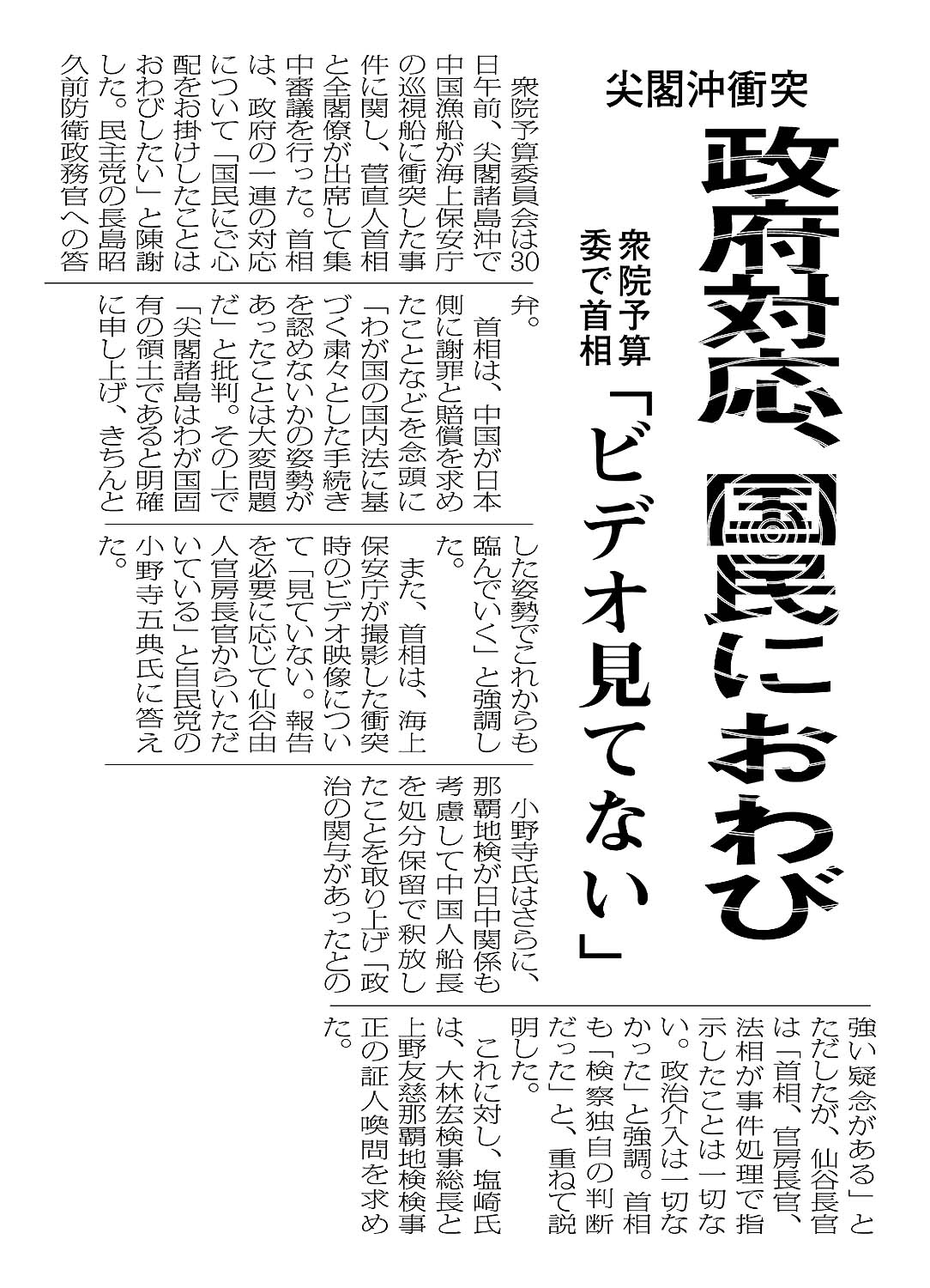 > 尖閣沖衝突/政府対応、国民におわび/衆院予算委で首相「ビデオ見てない」: