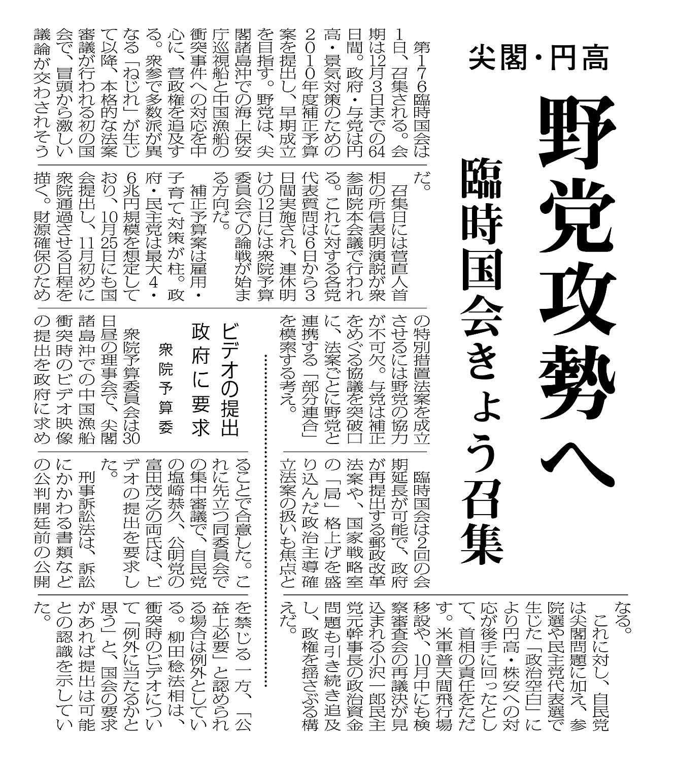 尖閣・円高/野党攻勢へ/臨時国会きょう召集