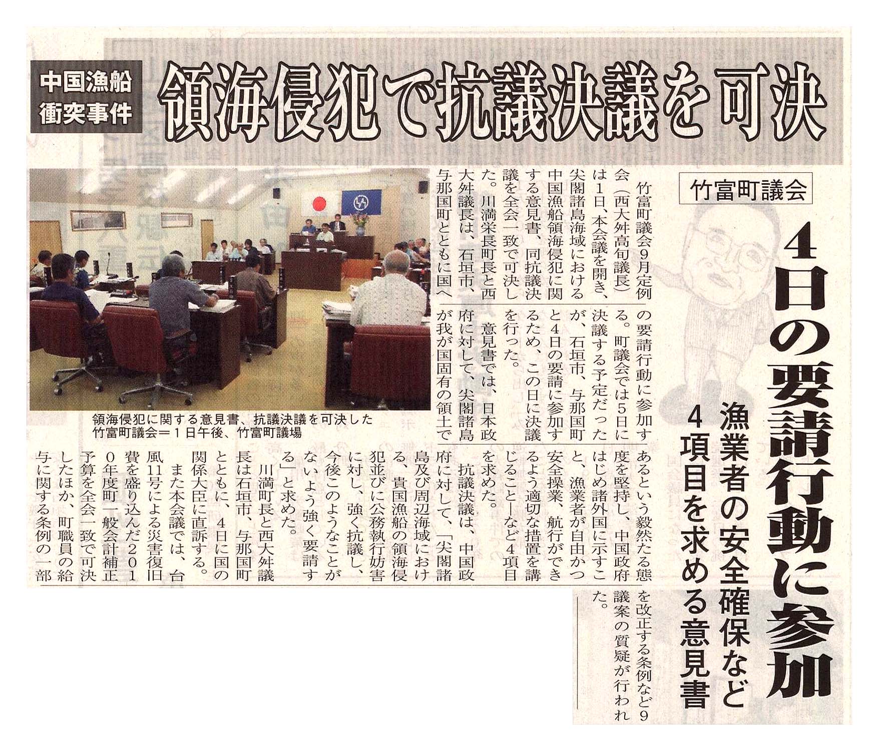 竹富島議会/中国漁船衝突事件/領海侵犯で抗議決議を可決/4日の要請行動に参加/漁業者の安全確保など4項目を求める意見書 現代仮名遣いテキスト