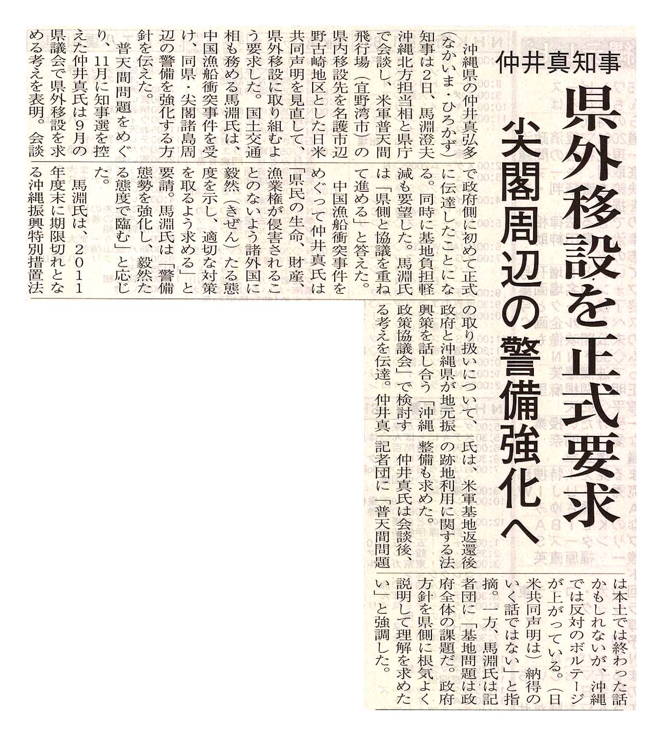 > 仲井真知事 県外移設を正式要求/尖閣周辺の警備強化へ: