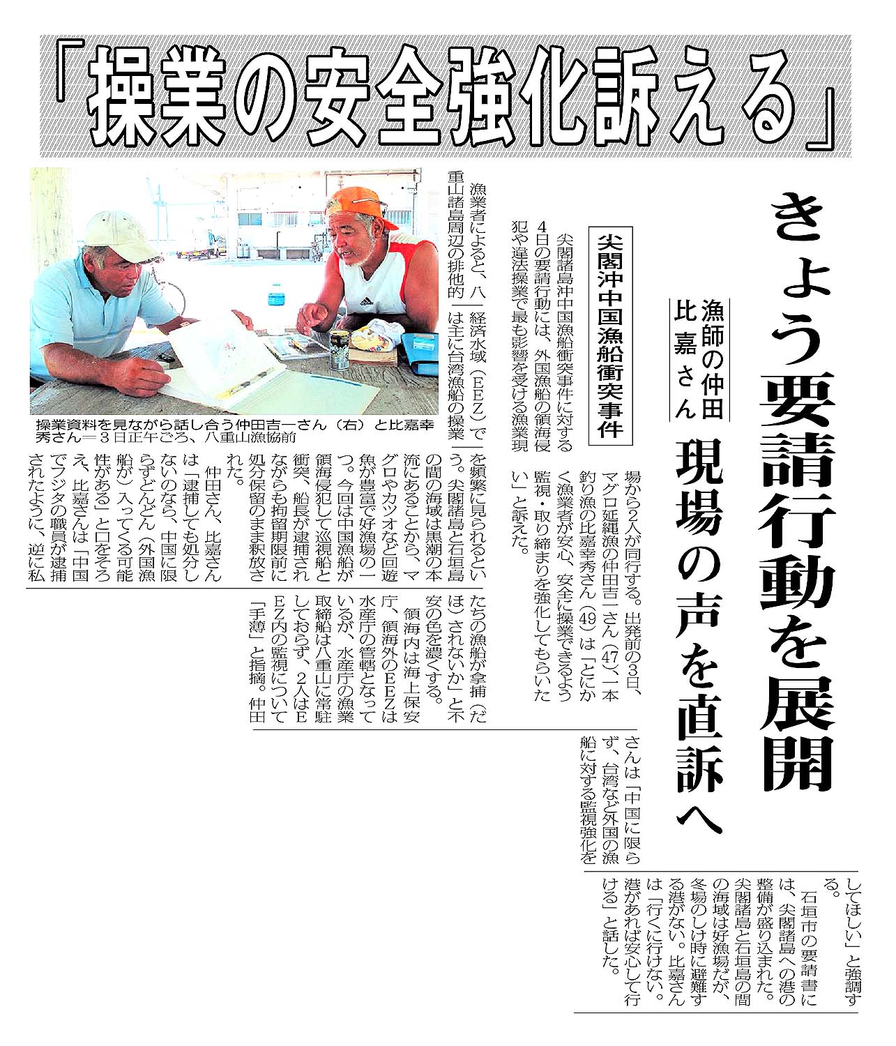「操業の安全強化訴える」/きょう要請行動を展開/漁師の仲田、比嘉さん 現場の声を直訴へ/尖閣沖中国漁船衝突事件 現代仮名遣いテキスト