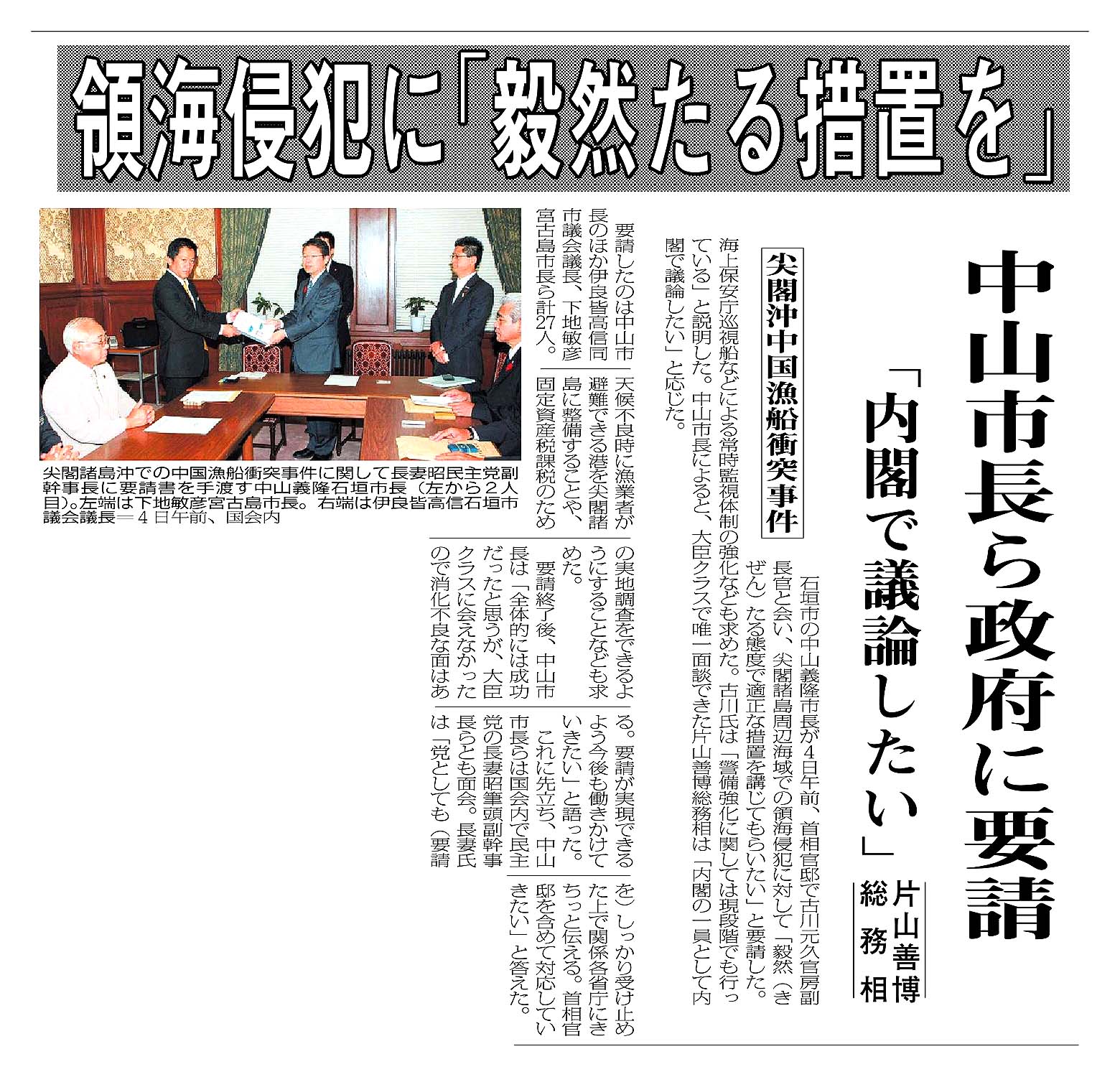 領海侵犯に「毅然たる措置を」/中山市長ら政府に要請/「内閣で議論したい」 片山善博総務相/尖閣沖中国漁船衝突事件 現代仮名遣いテキスト
