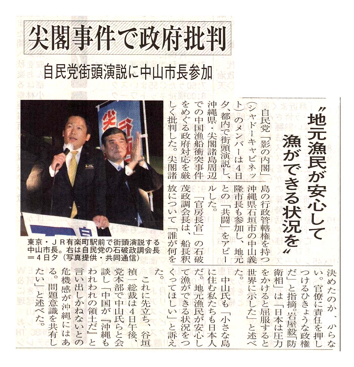 > 尖閣事件で政府批判/自民党街頭演説に中山市長参加/”地元漁民が安心して漁ができる状況を”:
