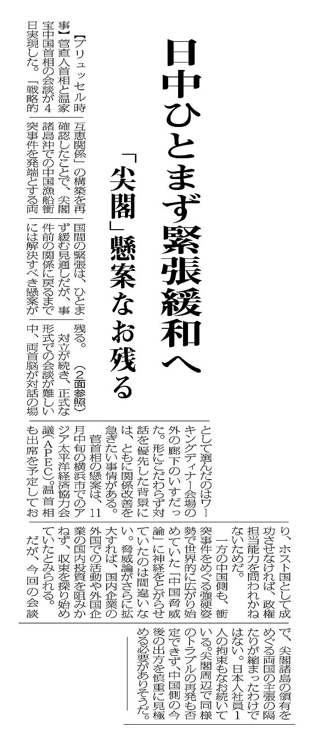 > 日中ひとまず緊張緩和へ/「尖閣」懸案なお残る: