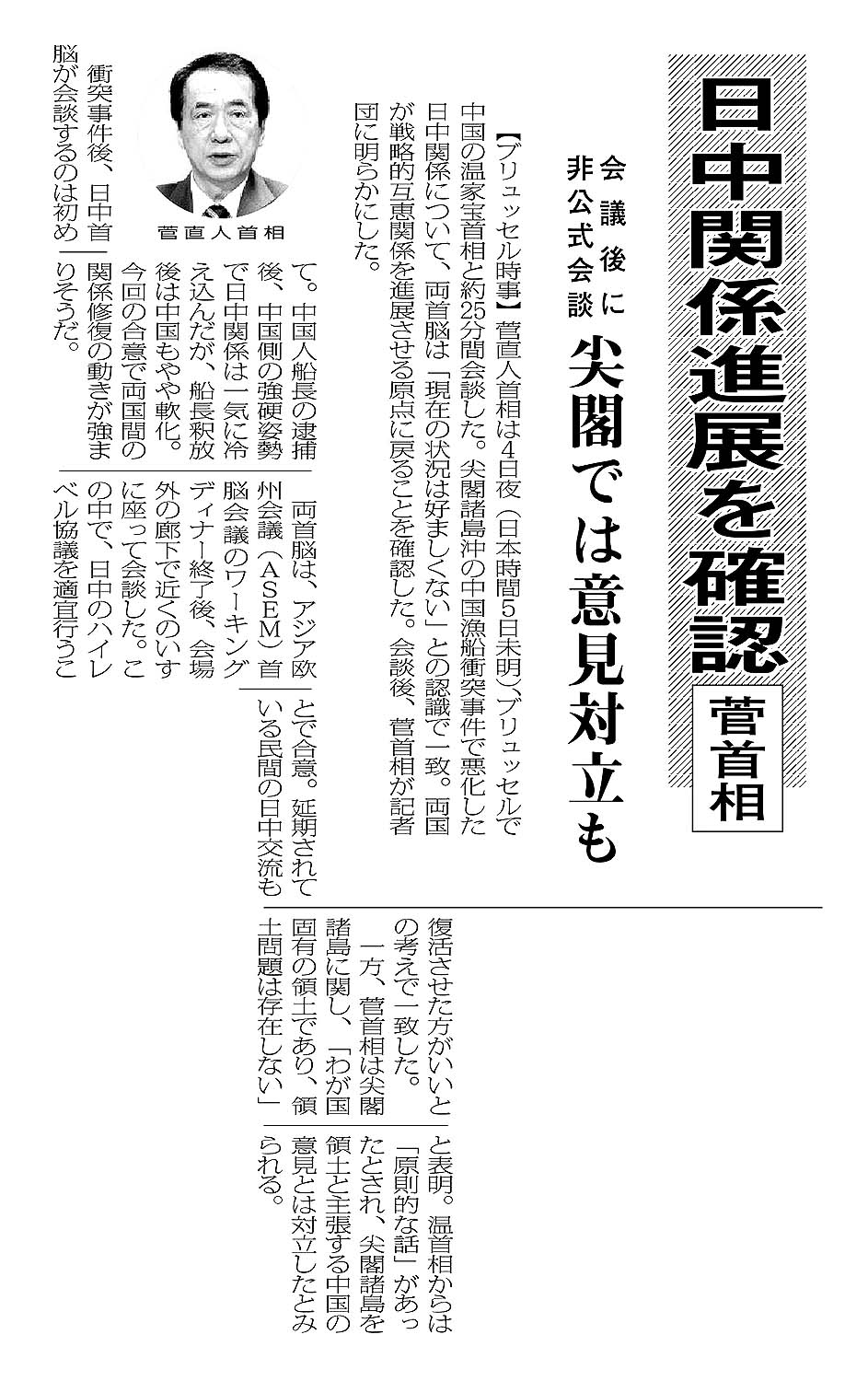 日中関係進展を確認/菅首相/会議後に非公式会談/尖閣では意見対立も