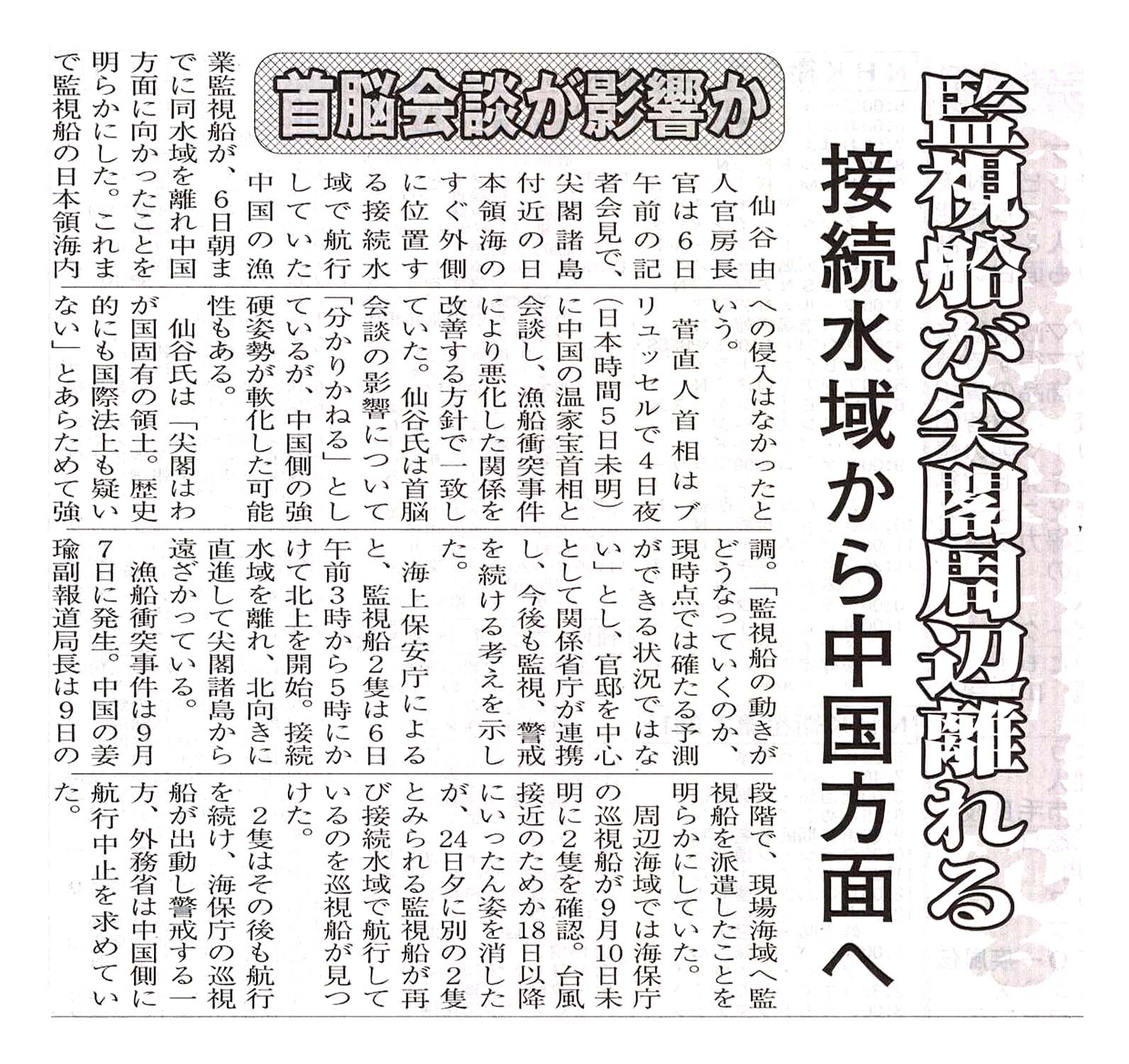 > 首脳会談が影響か/監視船が尖閣周辺離れる/接続水域から中国方面へ :