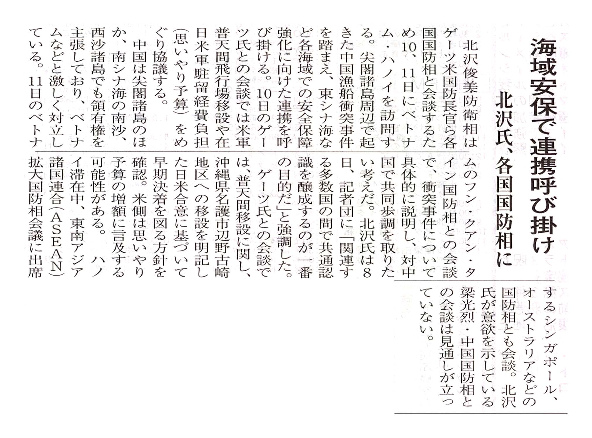 海域安保で連携呼び掛け/北沢氏、各国国防相に