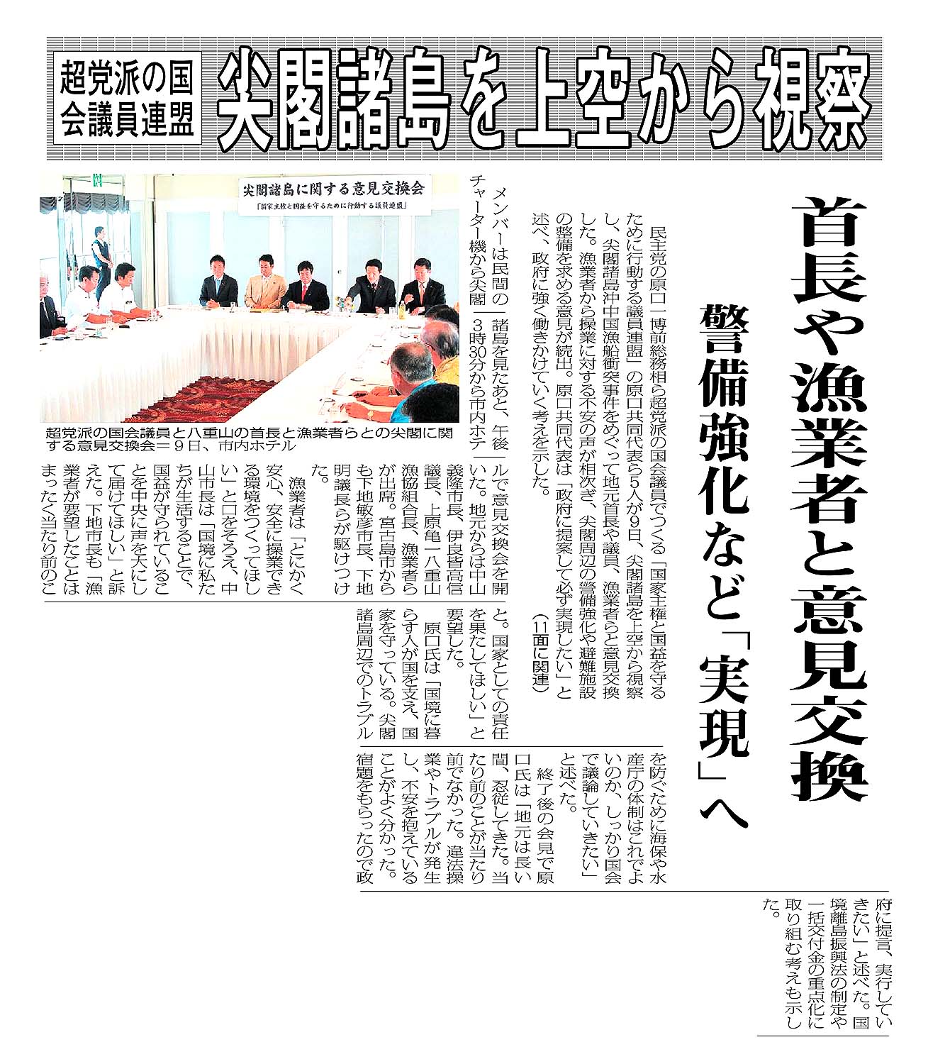> 超党派の国会議員連盟/尖閣諸島を上空から視察/首長や漁業者と意見交換/警備強化など「実現」へ: