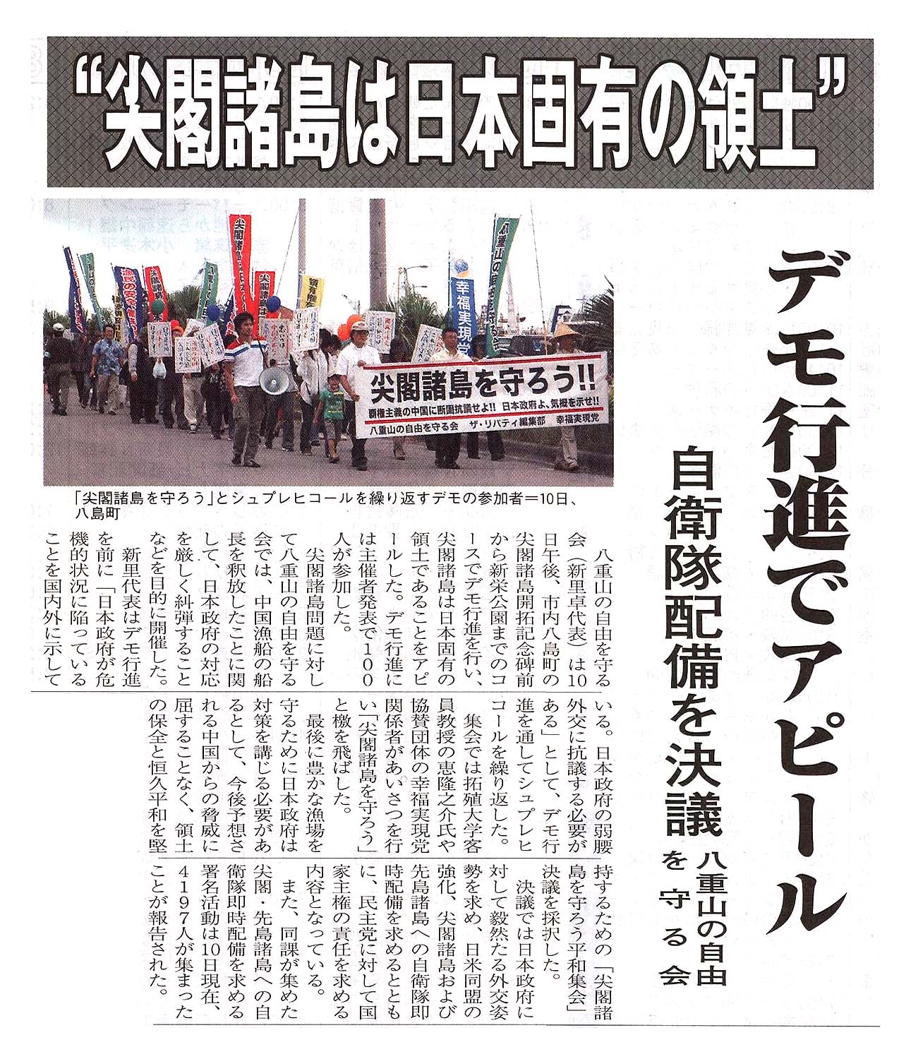 > ”尖閣諸島は日本固有の領土”/デモ行進でアピール/自衛隊配備を決議/八重山の自由を守る会: