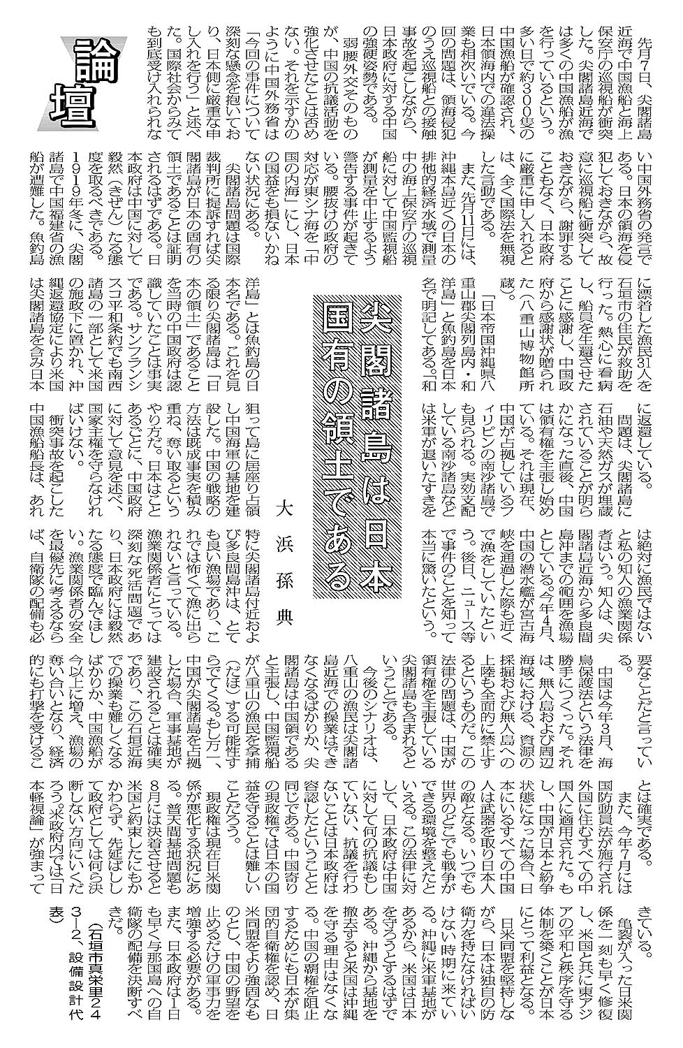 > <論壇>尖閣諸島は日本固有の領土である/大浜孫典: