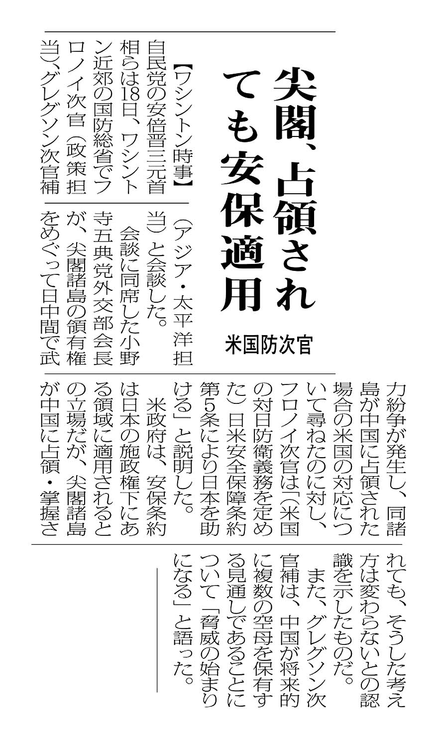 > 尖閣、占領されても安保適用/米国防次官: