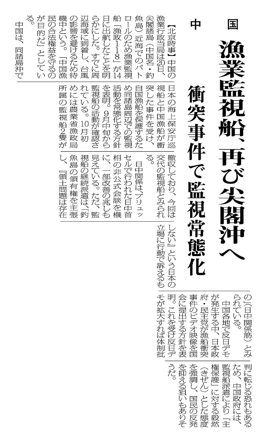 > 中国/漁業監視船、再び尖閣沖へ/衝突事件で監視常態化: