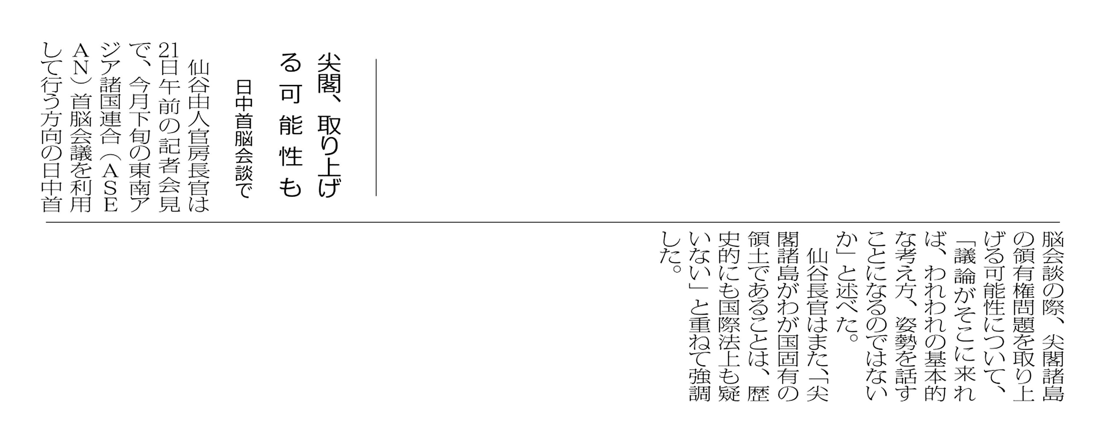 > 尖閣、取り上げる可能性も/日中首脳会談で :
