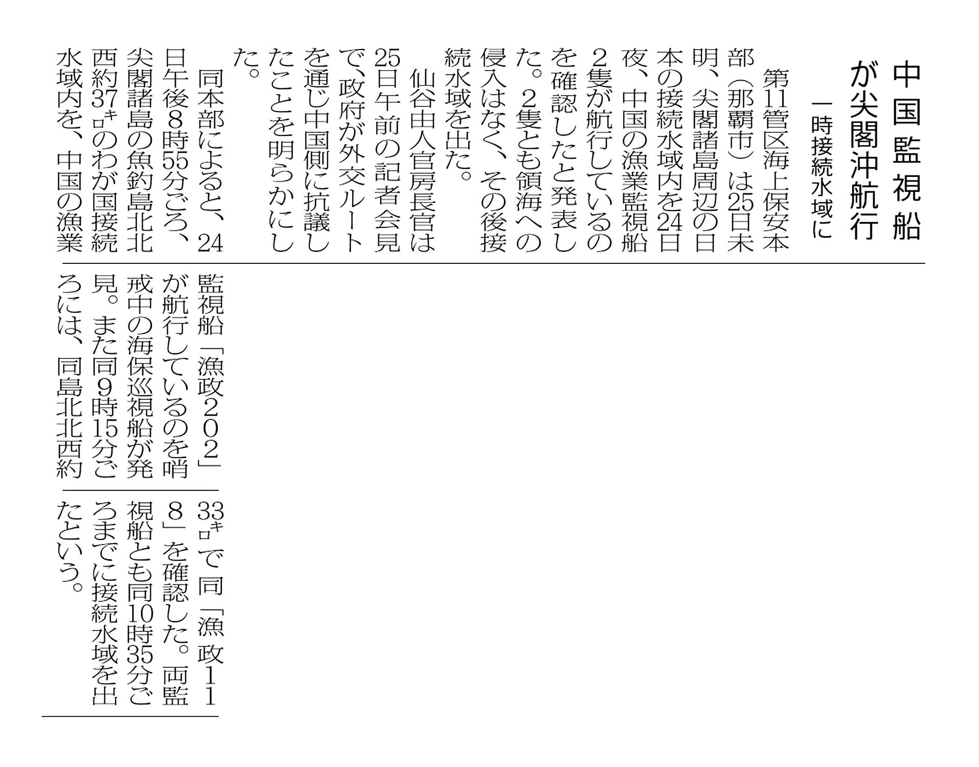 > 中国監視船が尖閣沖航行/一時接続水域に: