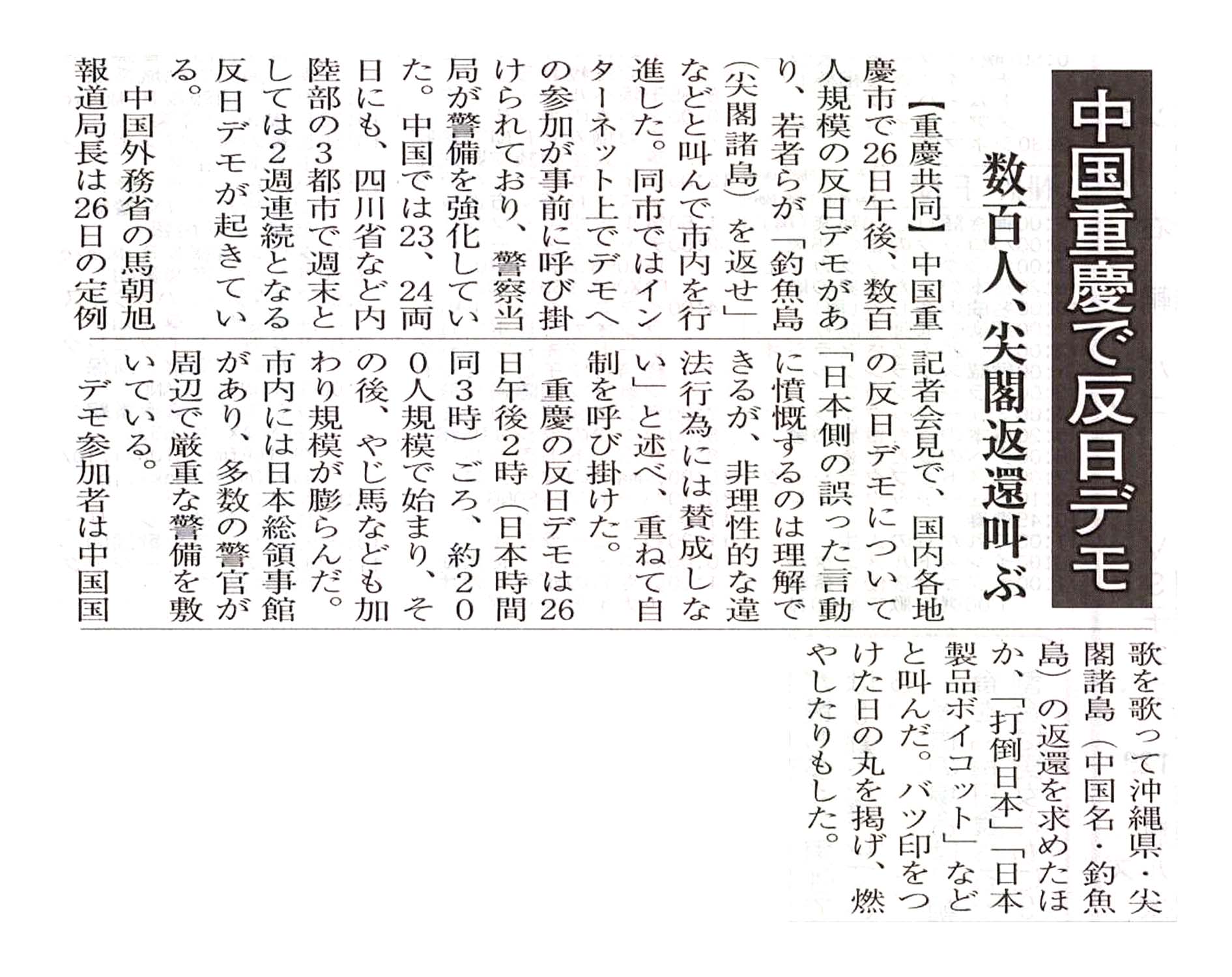 > 中国重慶で反日デモ/数百人、尖閣返還叫ぶ: