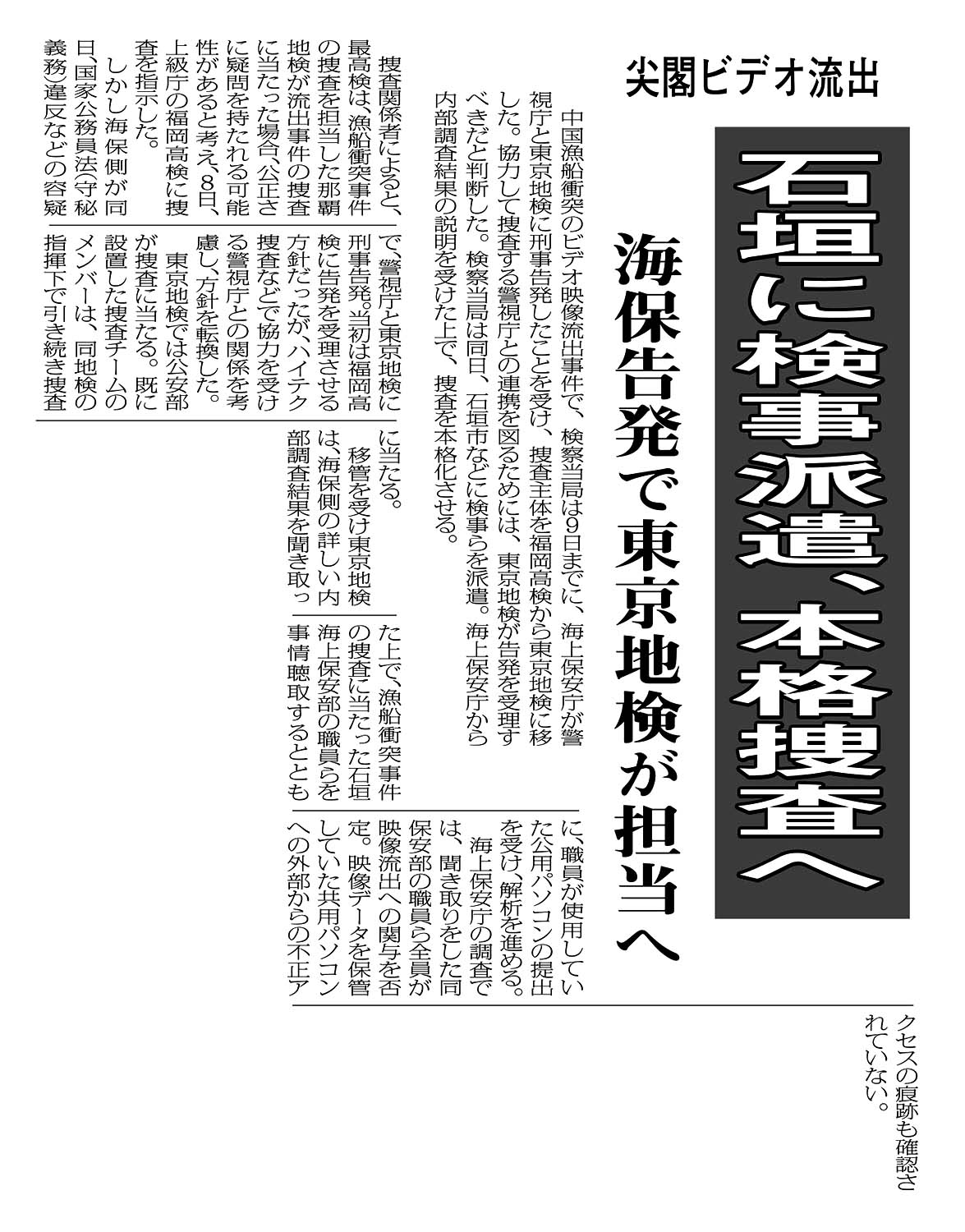> 尖閣ビデオ流出/石垣に検事派遣、本格捜査へ/海保告発で東京地検が担当へ: