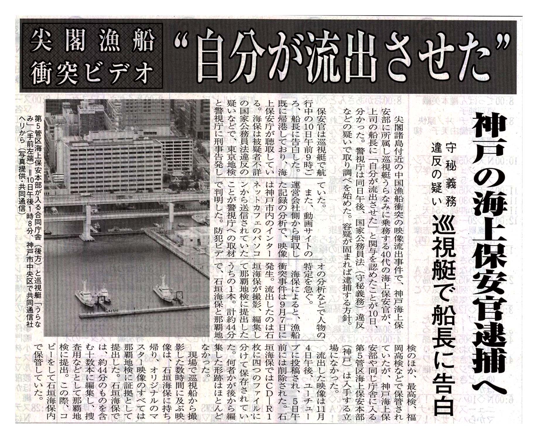 ”自分が流出させた” 尖閣漁船衝突ビデオ/神戸の海上保安官逮捕へ/守秘義務違反の疑い 巡視艇で船長に告白