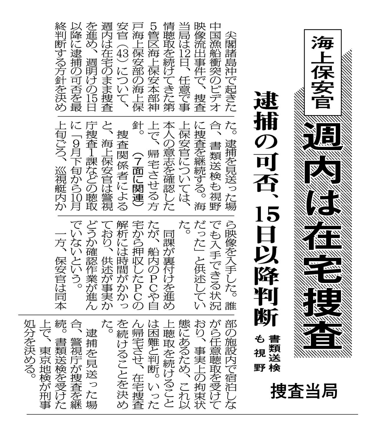 海上保安官 週内は在宅捜査/逮捕の可否、15日以降判断/書類送検も視野:/捜査当局