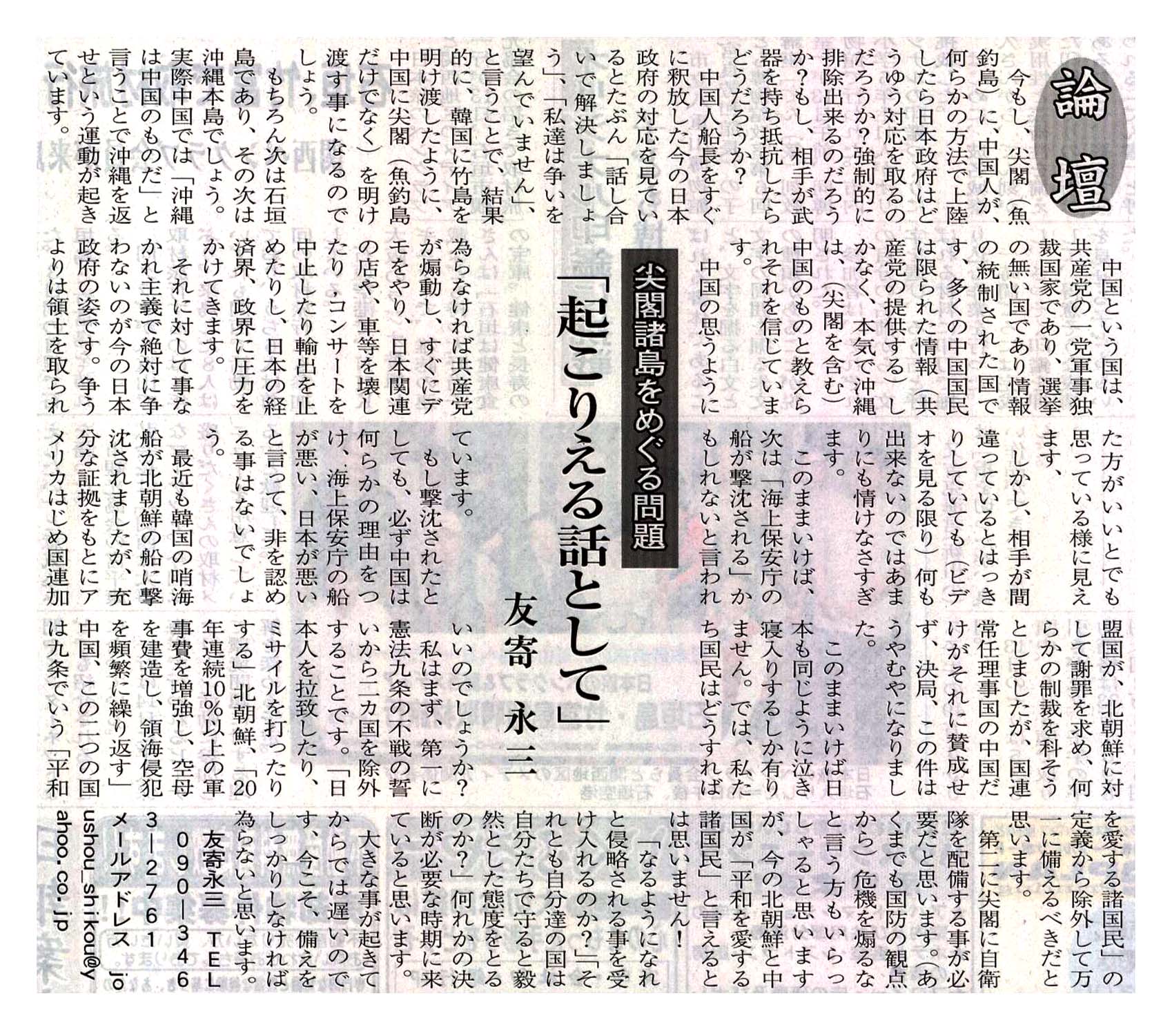 <論壇>尖閣諸島をめぐる問題/「起こりえる話として」/友寄永三