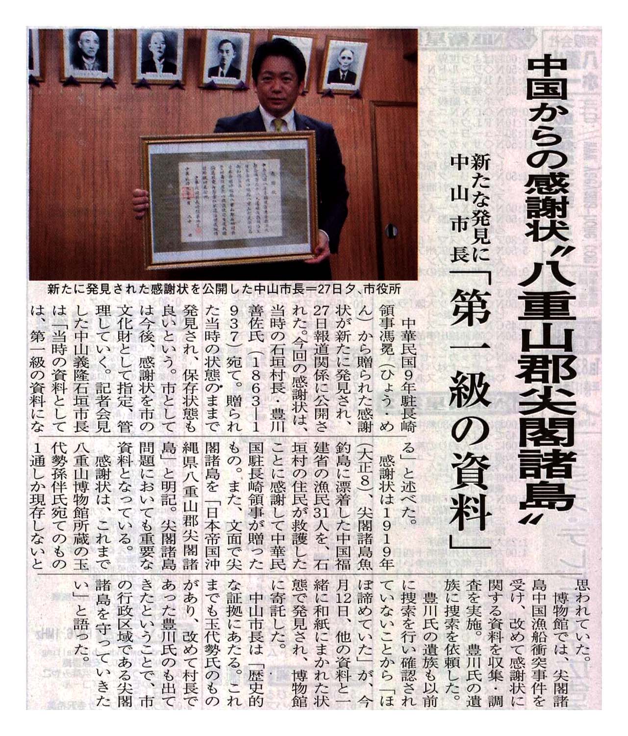 中国からの感謝状”八重山郡尖閣諸島”/新たな発見に中山市長「第一級の資料」