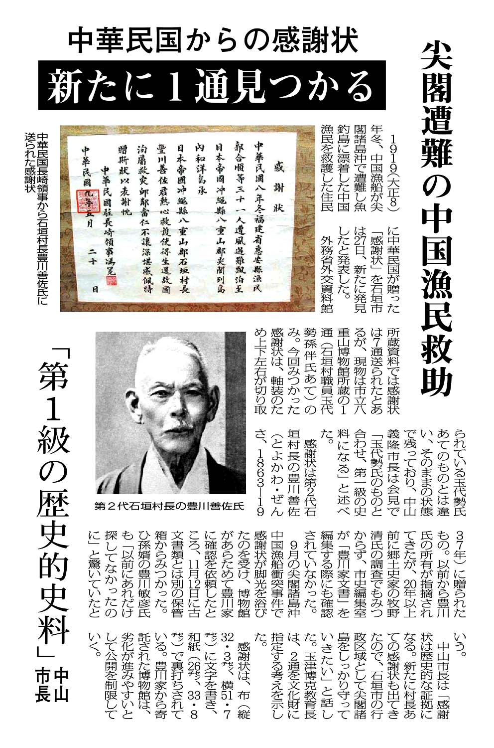 中華民国からの感謝状/新たに1通見つかる/尖閣遭難の中国漁民救助/「第1級の歴史的史料」/中山義隆 現代仮名遣いテキスト