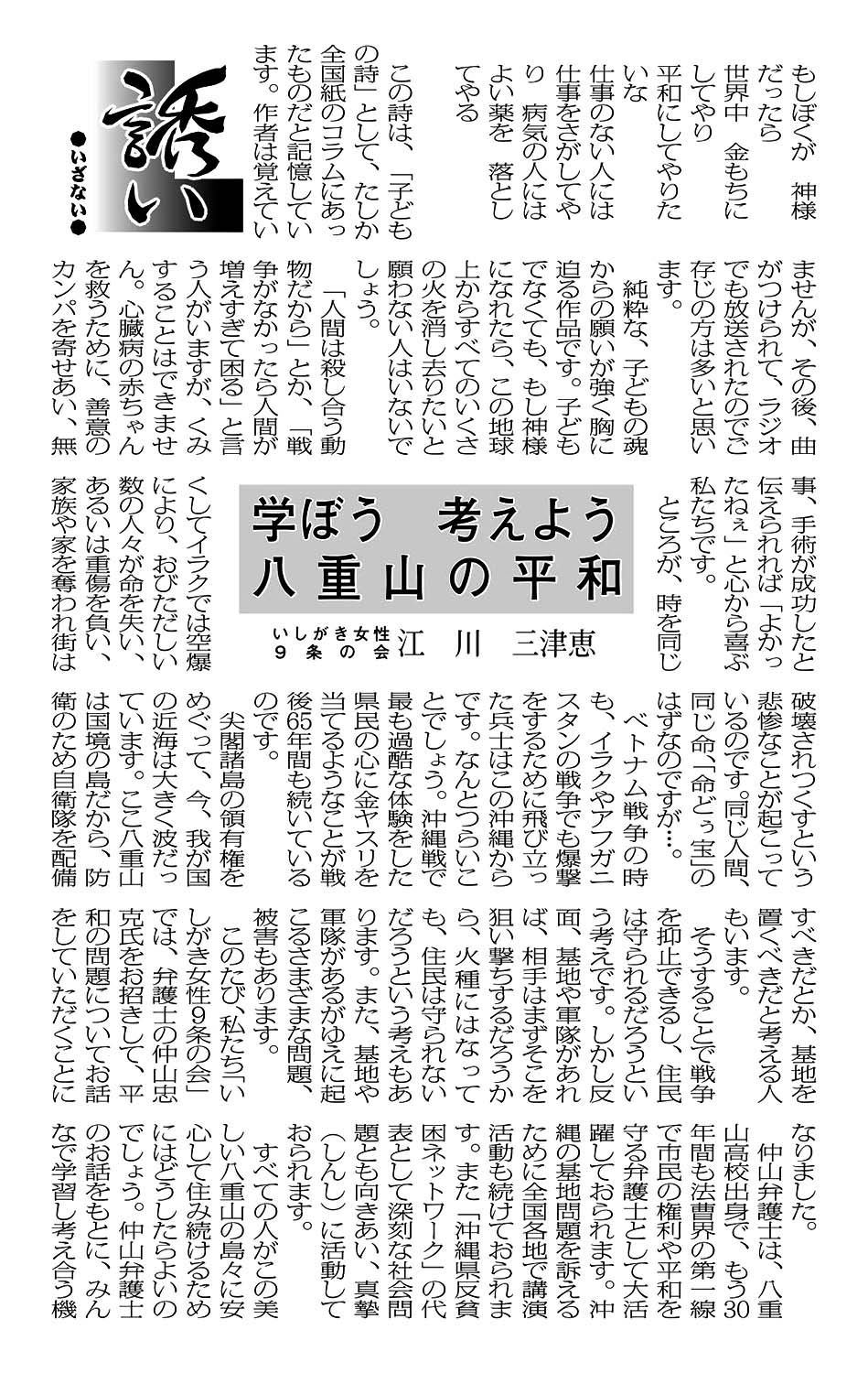 > <誘い>学ぼう 考えよう/八重山の平和/いしがき女性9条の会 江川三津恵:
