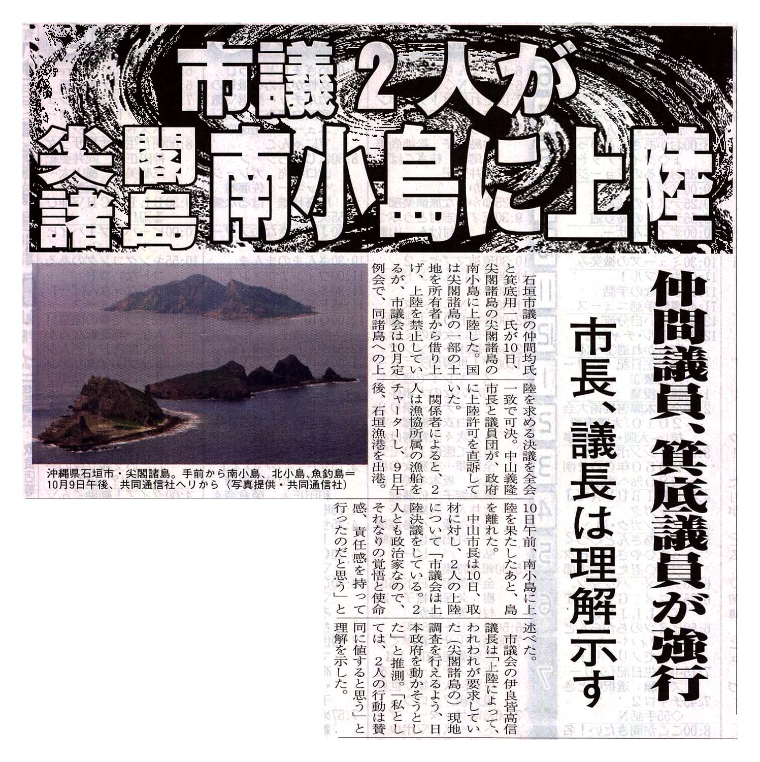 > 市議2名が尖閣諸島南小島に上陸/仲間議員、箕底議員が強行/市町、議長は理解示す: