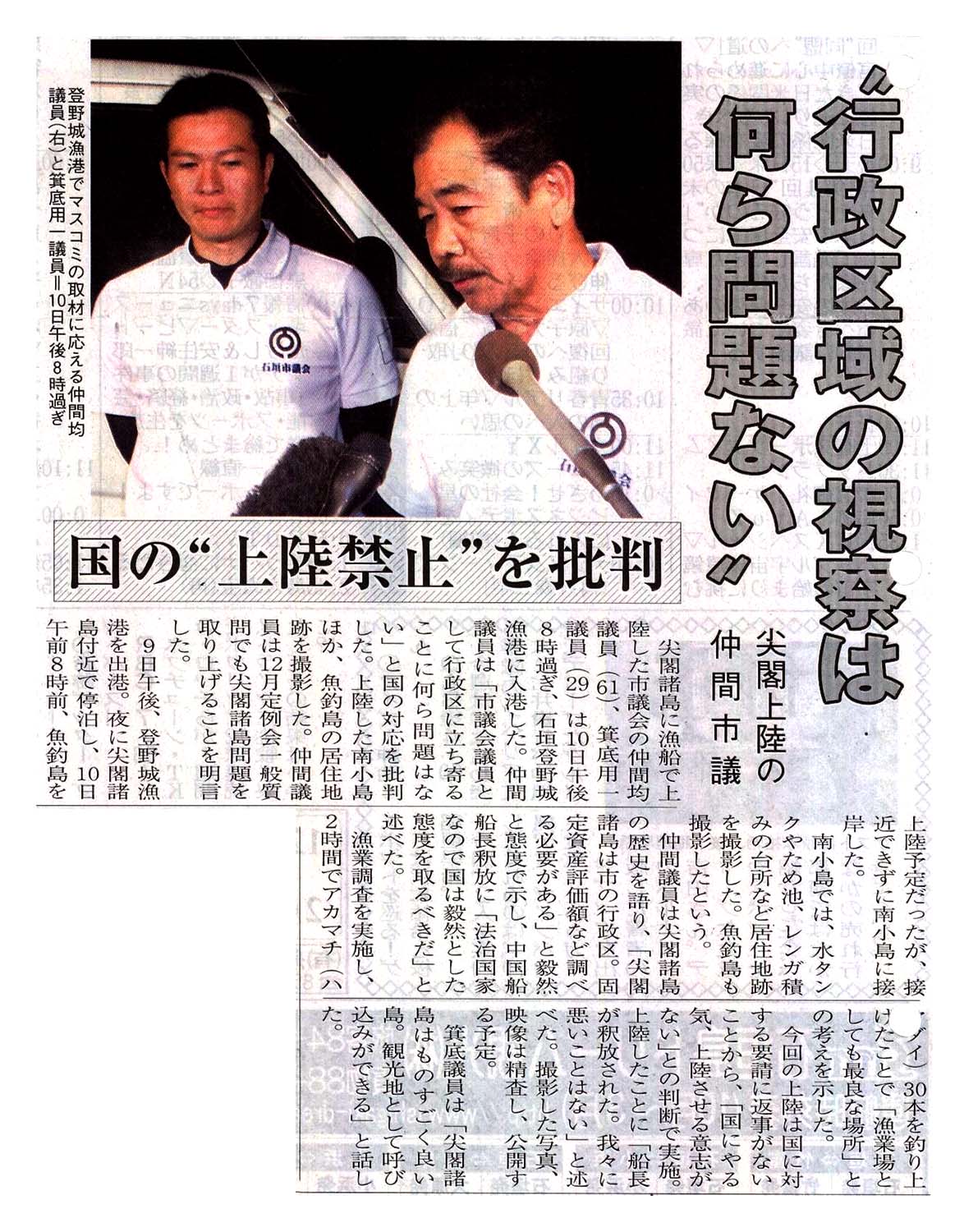 > ”行政区域の視察は何ら問題ない”/尖閣上陸の仲間市議/国の”上陸禁止”を批判: