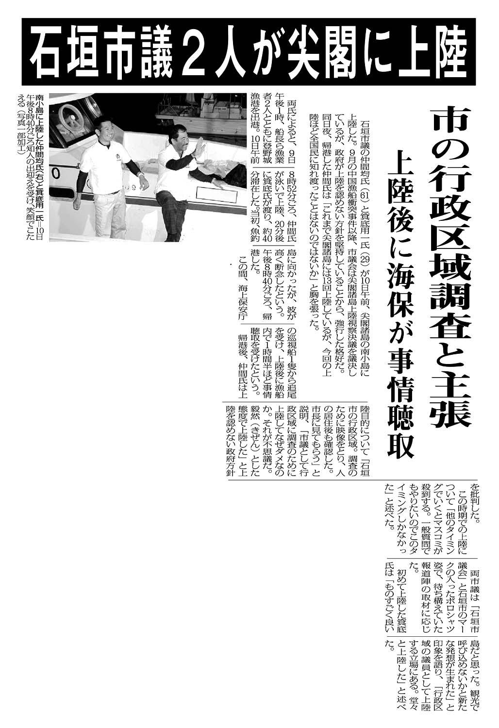 > 石垣市議2人が尖閣に上陸/市の行政区域調査と主張/上陸後に海保が事情聴取: