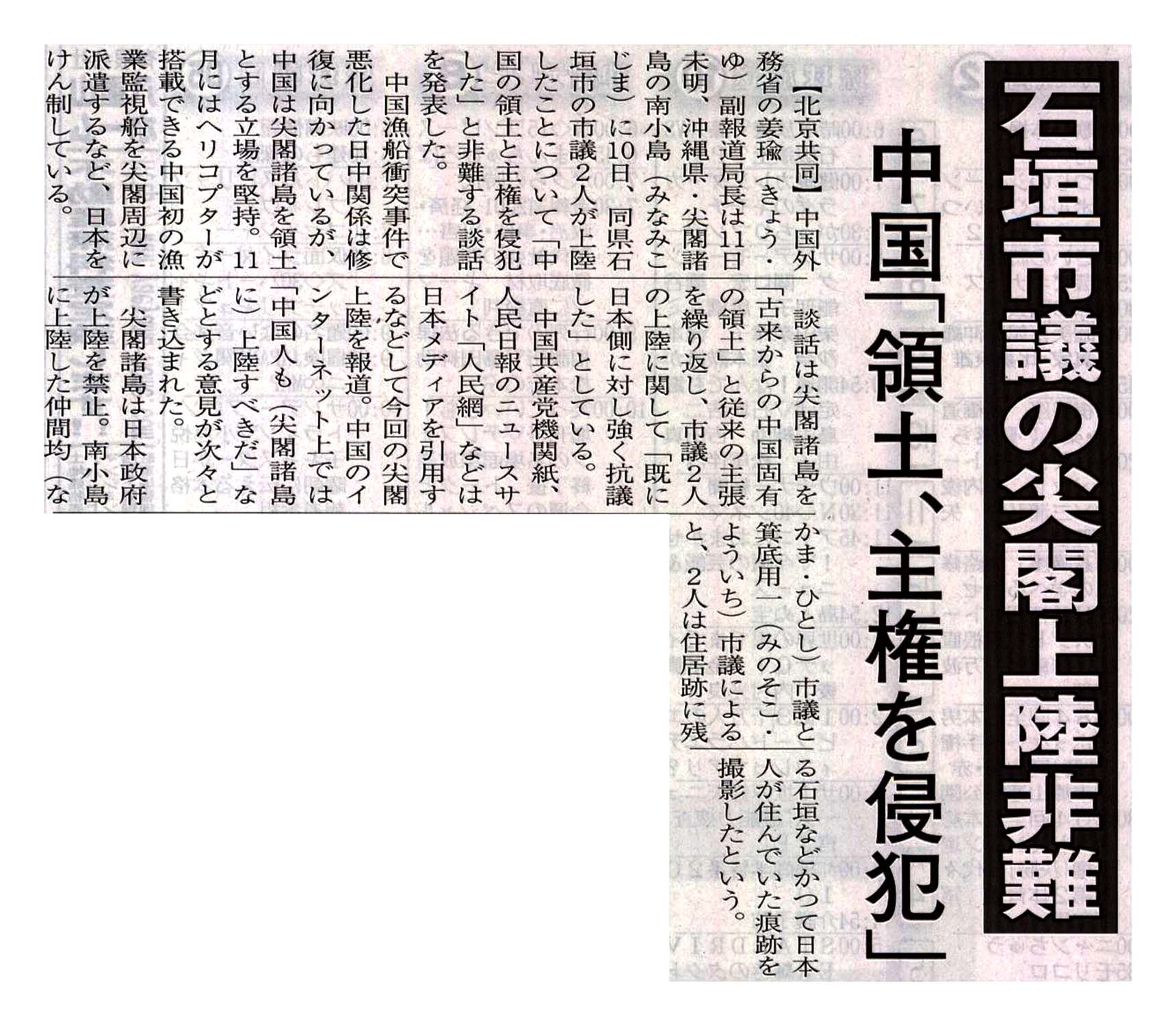 > 石垣市議の尖閣上陸非難/中国「領土、主権を侵犯」: