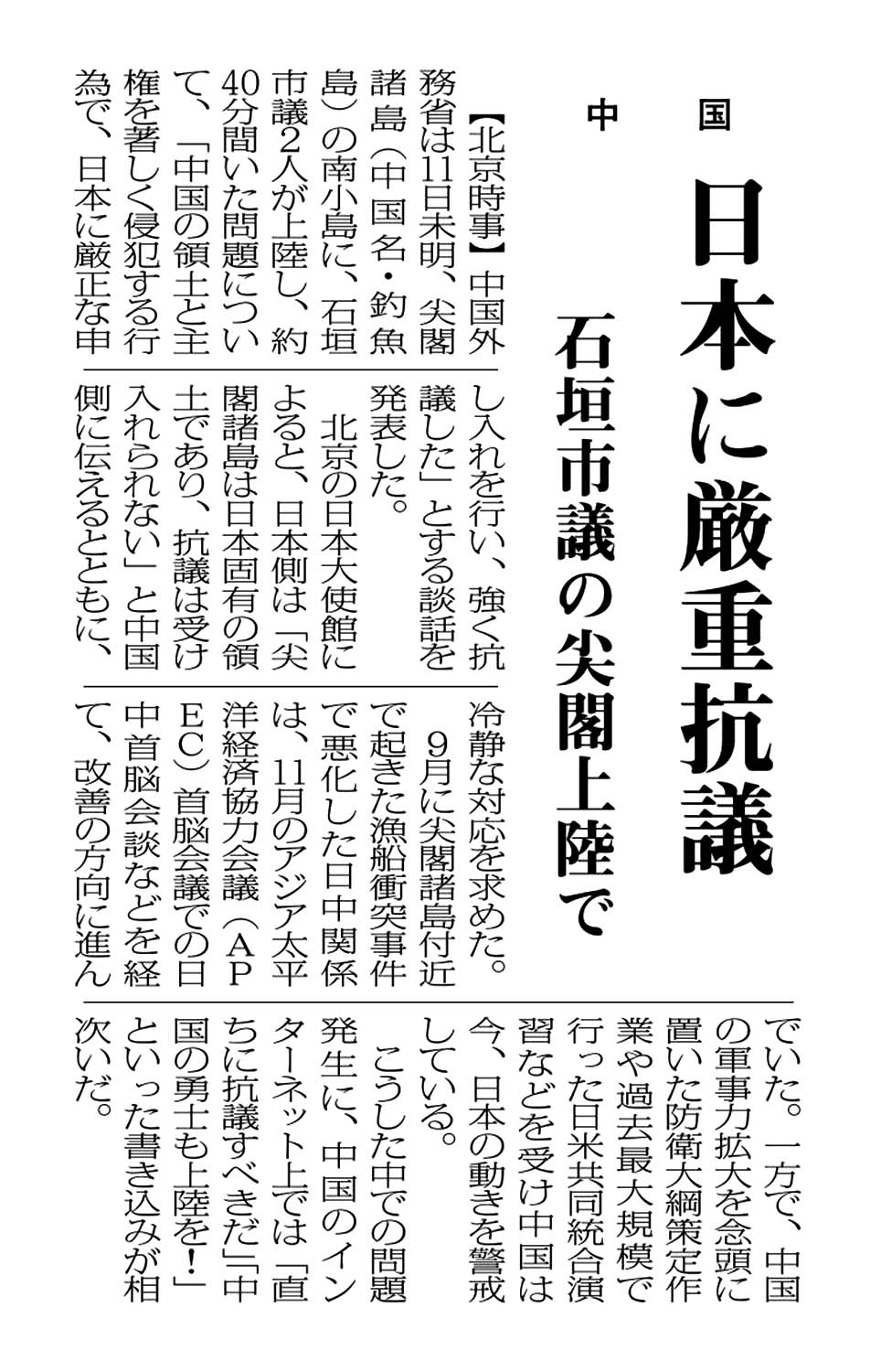 > 中国/日本に厳重抗議/石垣市議の尖閣上陸で :