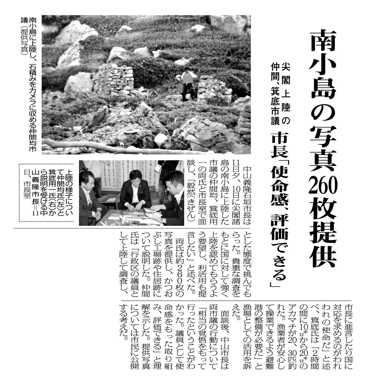 > 南小島の写真260枚提供/尖閣上陸の仲間、箕底市議/市長「使命感、評価できる」: