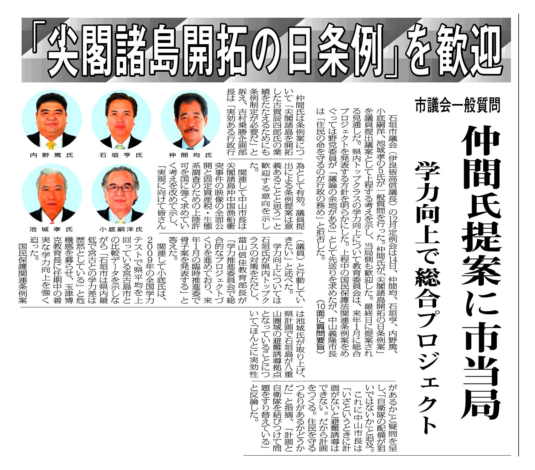 「尖閣諸島開拓の日条例」を歓迎/仲間氏提案に市当局/学力向上で総合プロジェクト/市議会一般質問