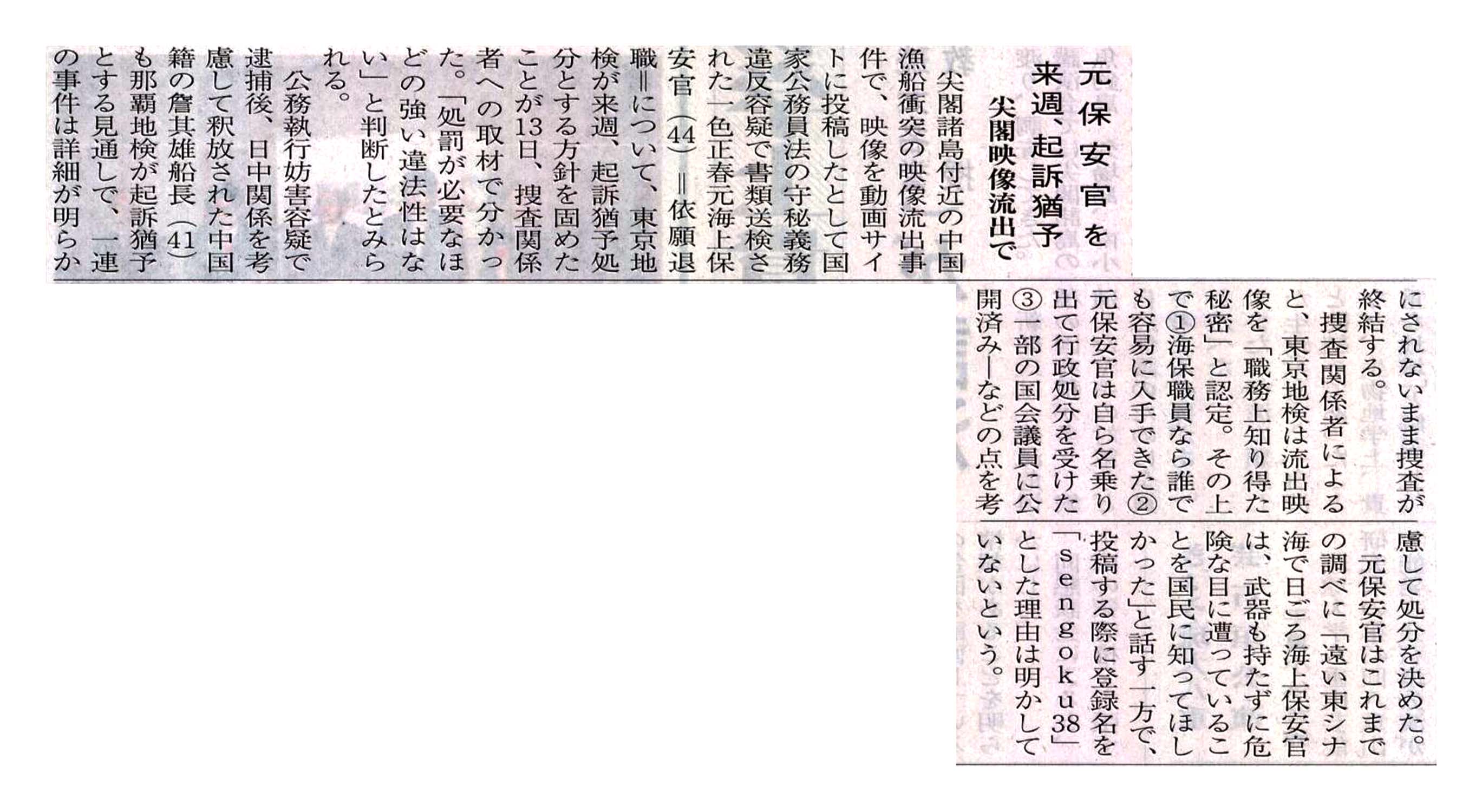 > 元保安官を来週、起訴猶予/尖閣映像流出で: