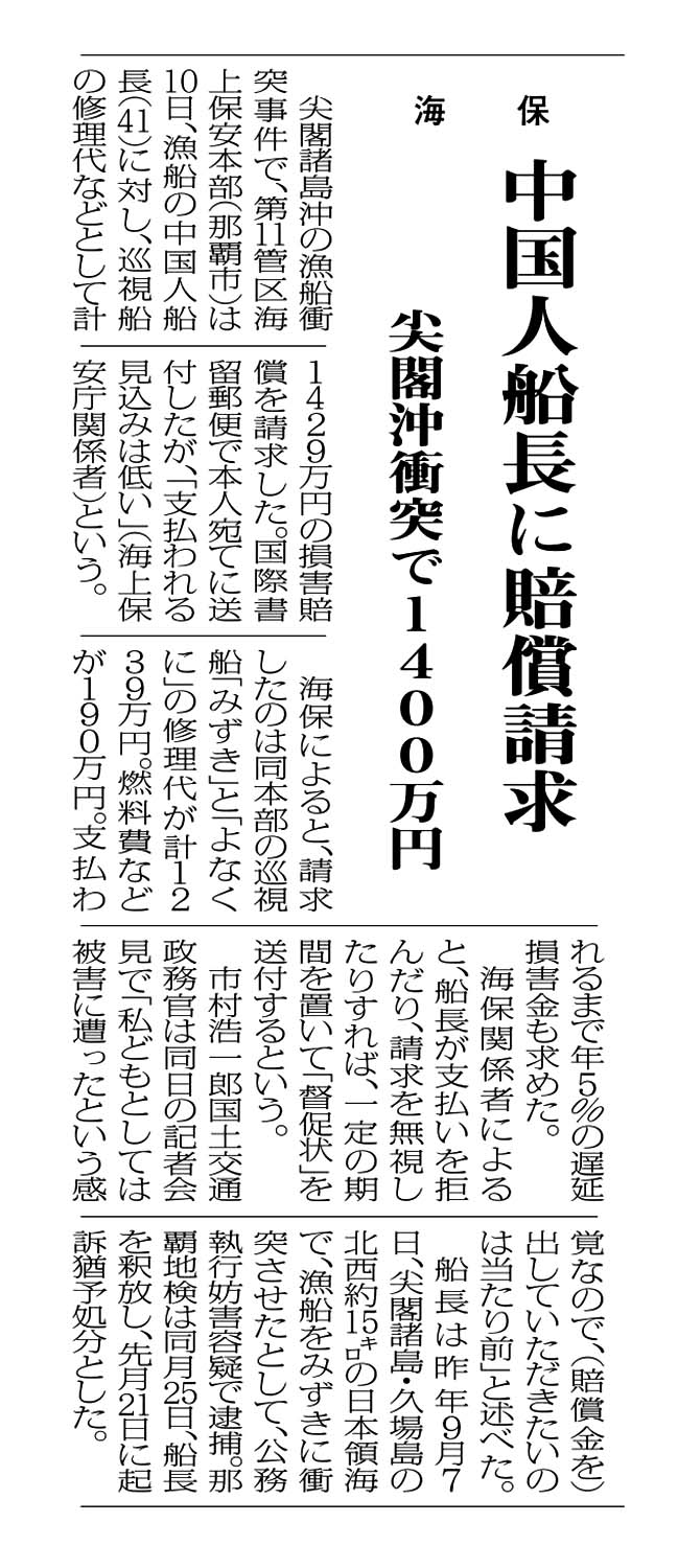 > 海保/中国人船長に賠償請求/尖閣沖衝突で1400万円: