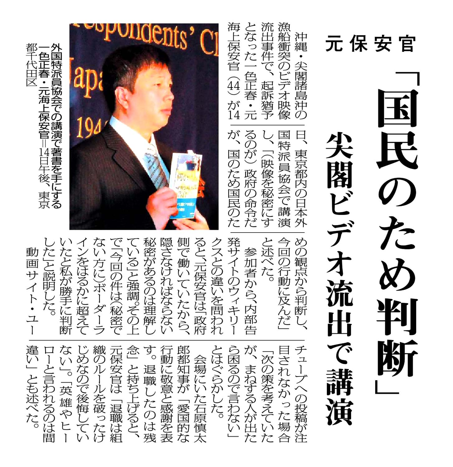 > 元保安官/「国民のため判断」/尖閣ビデオ流出で講演: