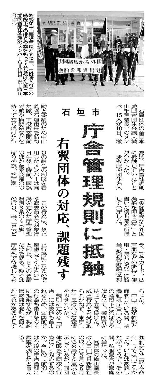 > 石垣市/庁舎管理規則に抵触/右翼団体の対応、課題残す: