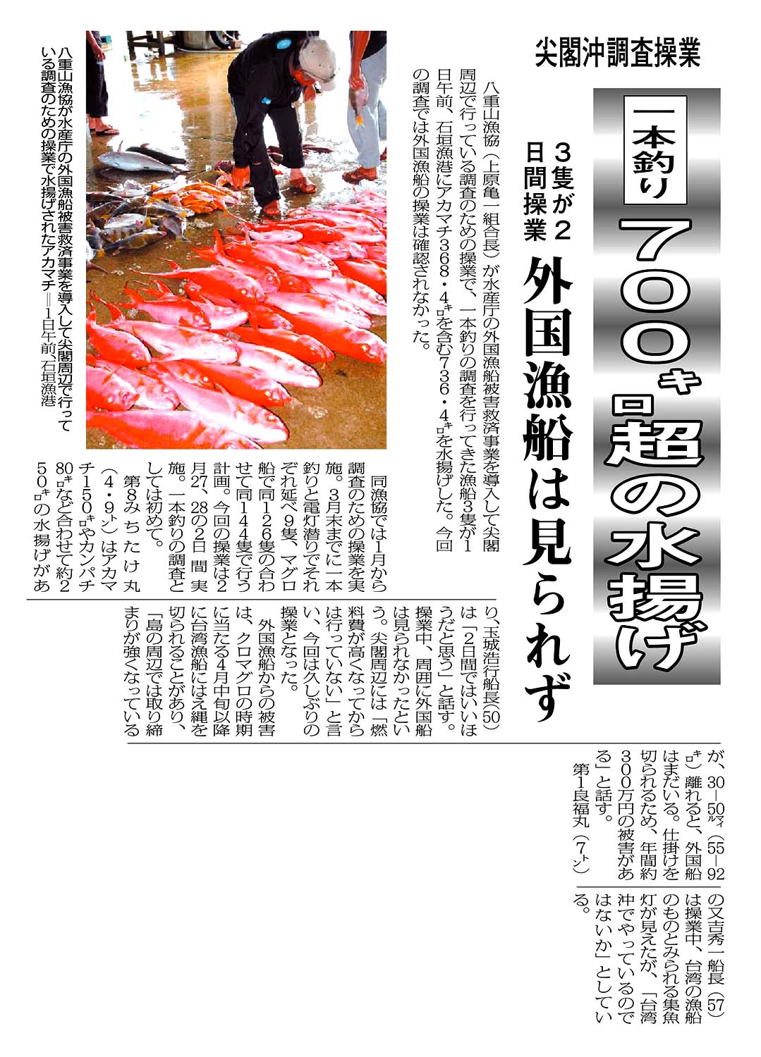 > 尖閣沖調査操業/一本釣り700キロ超の水揚げ/3隻が2日間操業/外国漁船は見られず: