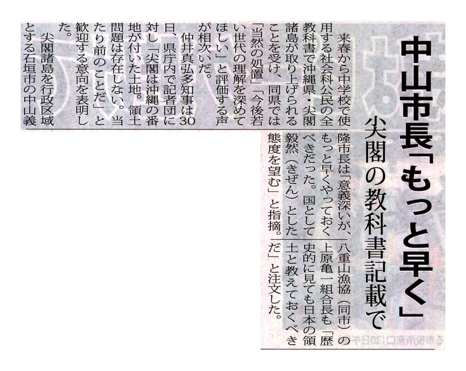 > 中山市長「もっと早く」/尖閣の教科書記載で: