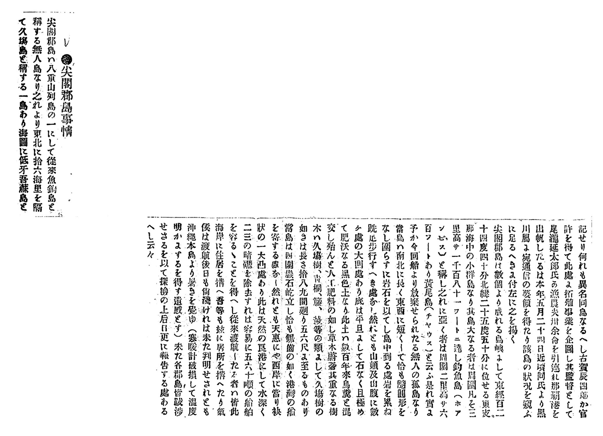 尖閣群島は数個より成れる島嶼にして、東経百二十四度四十分、北緯二十五度五十分に位せる東支那海中の小群島なり。其島大なる者は周囲凡そ三里、高さ一千百八十一フートに達し、釣魚島(ホアンピス)と称し、之れに次ぐ者は周囲二里、高さ六百フートあり、黄尾島(チヤウス)と言う。是れ実に予が今回船より放棄せられたる無人の孤島なり。当島は南北に長く東西に短くして恰も楕円形をなし、囲らずに岩石を以てし島中到る所岩を累ね、跣足歩行すべき処なし。然れども山顚及山腹に数ヶ所の大凹所あり。底は平坦にして石なく、且極めて肥沃なる黒色土なり。此土は数百年来鳥糞と混交し、殆んど人工肥料の如し。草木蔚蒼其重なる樹木は、久場樹、青桐、籐、葮等の類にして、久場樹の如きは長さ十八、九間、廻り五、六尺に至るものあり。当島は四囲巌石屹立し、恰も鋸歯の如く港湾の船を寄する所なし。然れども天恵にや西岸に当り、袂状の一大凸所あり。此は天然の良港にして水深く、二、三の暗礁を除去すれば容易に五、六十屯の船舶を容るゝことを得べし。従来渡航したる者は皆此海岸に住居を構え、吾等も茲に居所を構えたり。気候は渡航後日も尚浅ければ未だ判明せざれども、沖縄本島より暑きを覚ゆ(寒暖計破損して温度明かにするを得ず。遺憾とす)。未だ各群島皆抜渉せざるを以て、探検の上後日更に報告する処あるべし云々。