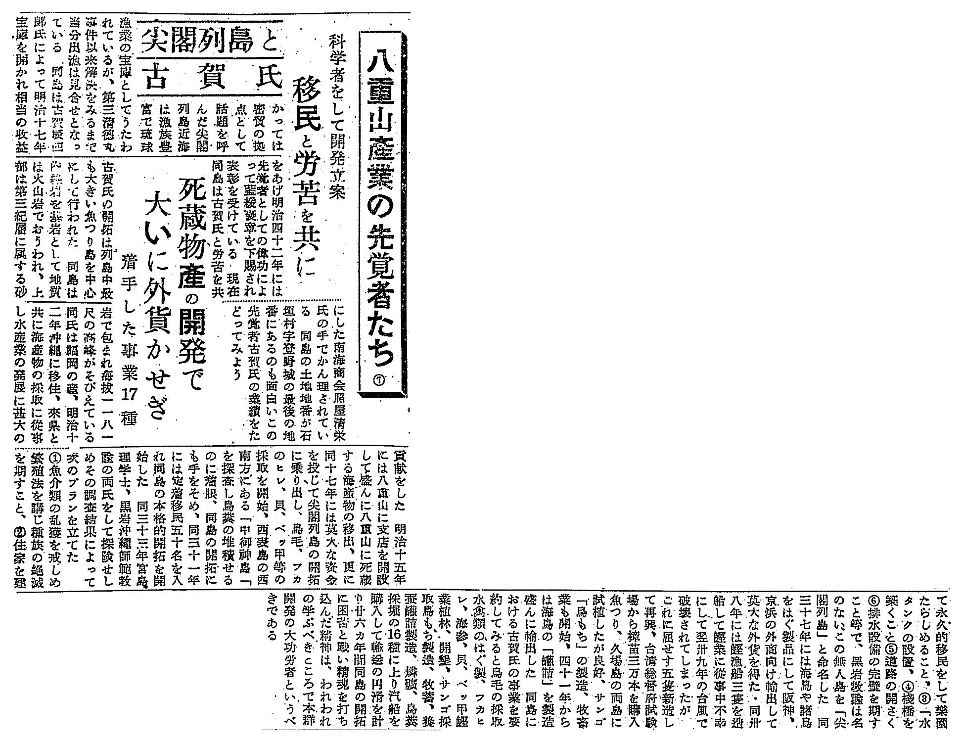 > < 八重山産業の先覚者たち⑦ >尖閣列島と古賀氏/科学者をして開発立案/移民と労苦を共に: