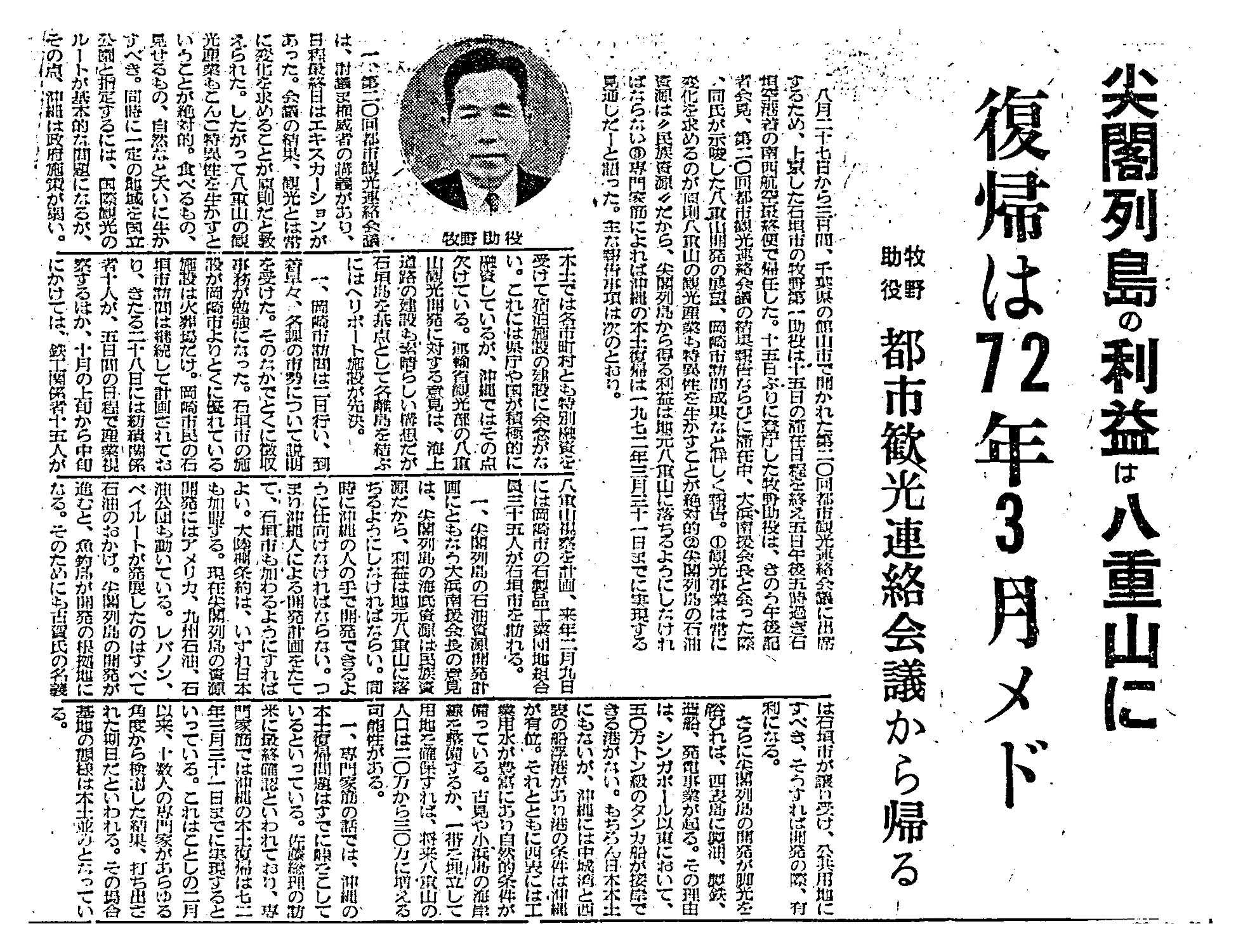 > 尖閣列島の利益は八重山に/復帰は72年3月メド/牧野助役 都市観光連絡会議から帰る :