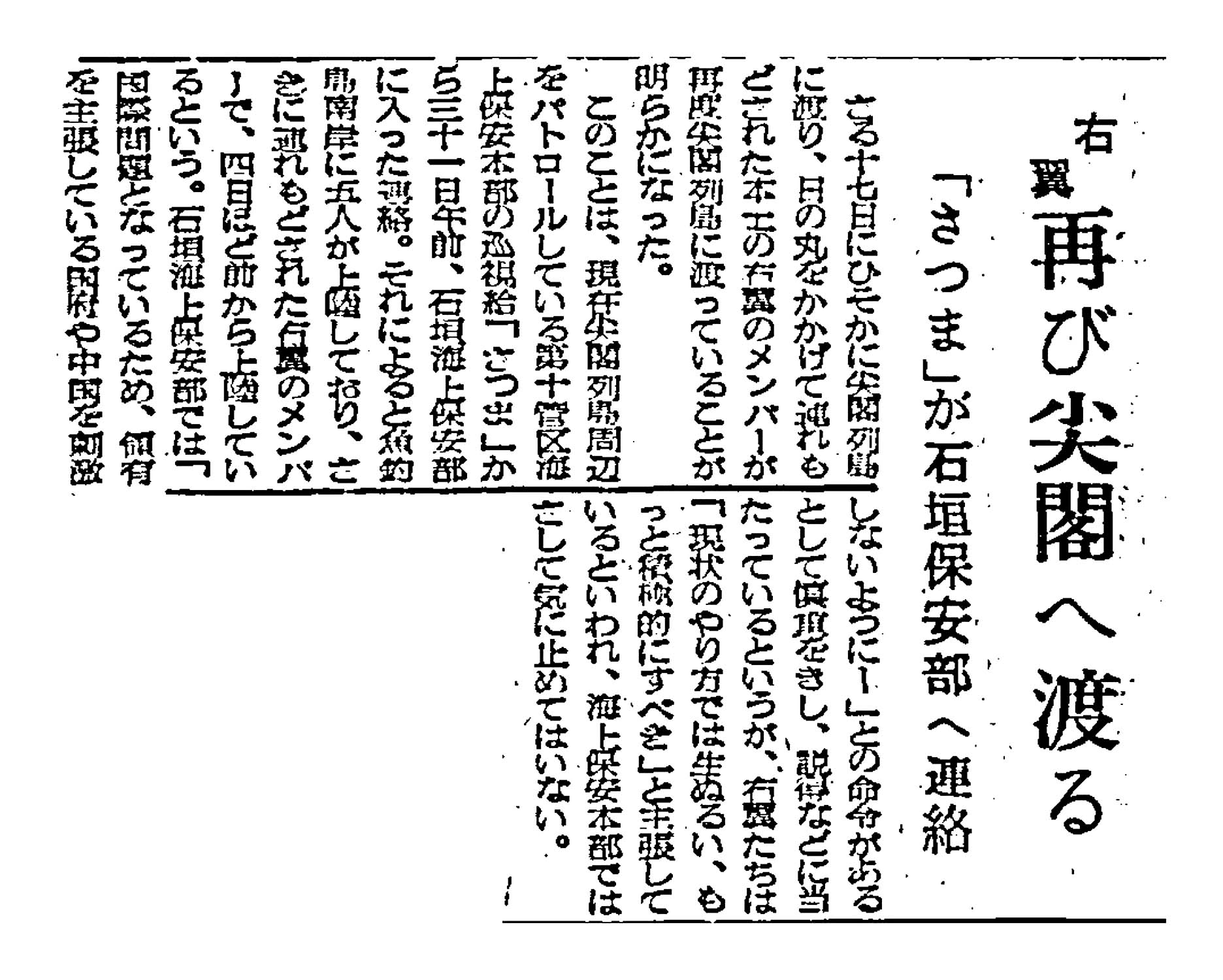 > 右翼再び尖閣へ渡る/「 さつま 」が石垣海保部へ連絡: