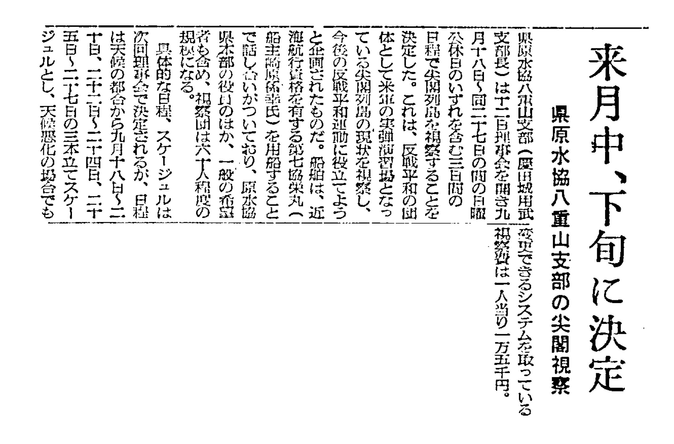 > 来月中、下旬に決定/県原水協八重山支部の尖閣視察: