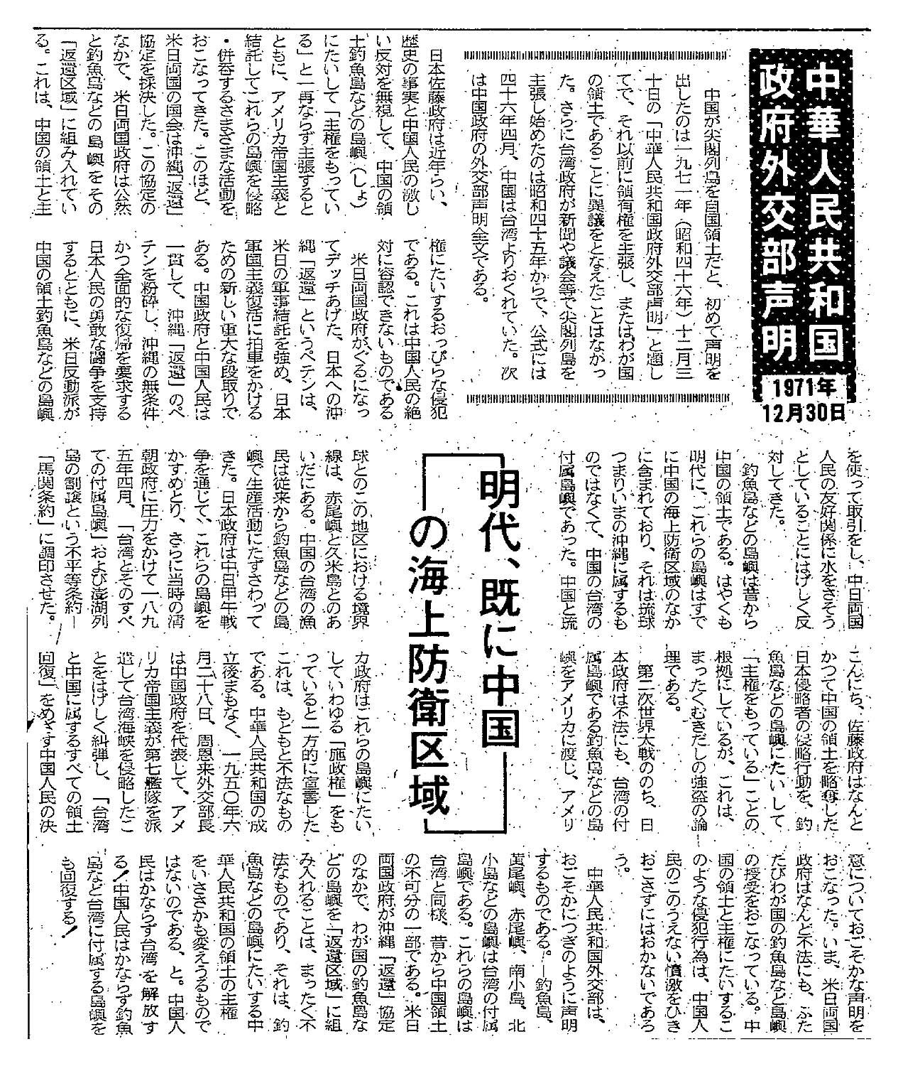 > < 中華人民共和国政府外交部声明 1971年12月30日 >明代、既に中国の海上防衛区域: